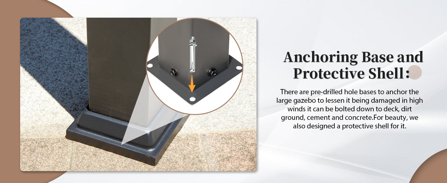- Before using the gazebo, please be certain that the four anchoring stands are sturdily anchored into the ground.