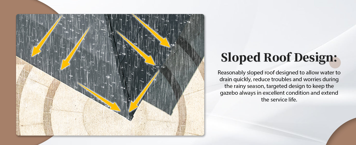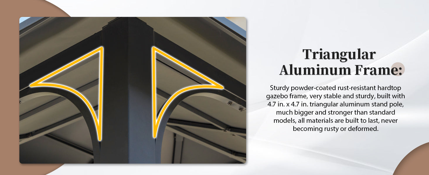 - 【Stable Structure】The metal roof gazebos use larger integral parts and tighter parts to ensure that the gazebo is very stable without any shaking in windy weather. In addition, the 4 rustproof iron pillars of our outdoor gazebo are designed with a triangular structure, bolt connections, and welded T-frame making the gazebo more stable. Excellent weather resistance ensures your long-term use.