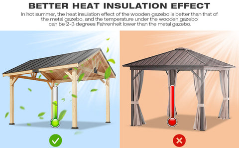 【Unique Asphalt Roof】Asphalt has good thermal insulation, waterproof, anti-penetration functions, and can reduce the noise caused by rain. Asphalt has a light texture and can reduce the burden on a solid wood gazebo. The sturdy triangular construction allows the canopy to easily withstand up to 10 inches of thick snow. Allowing you and your family to safely spend spring, summer, autumn, and winter under this gazebo.