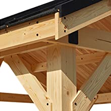 【Practical Design】Each column with a pre-drilled hole panel easily attaches to any type of floor. The ubiquitous triangular structure and the reinforced rust-proof iron sheets at the joints greatly enhance the stability of the gazebo. The wood gazebo adopts a reasonable slope design that allows water to flow out fast to guard against rainwater massing.