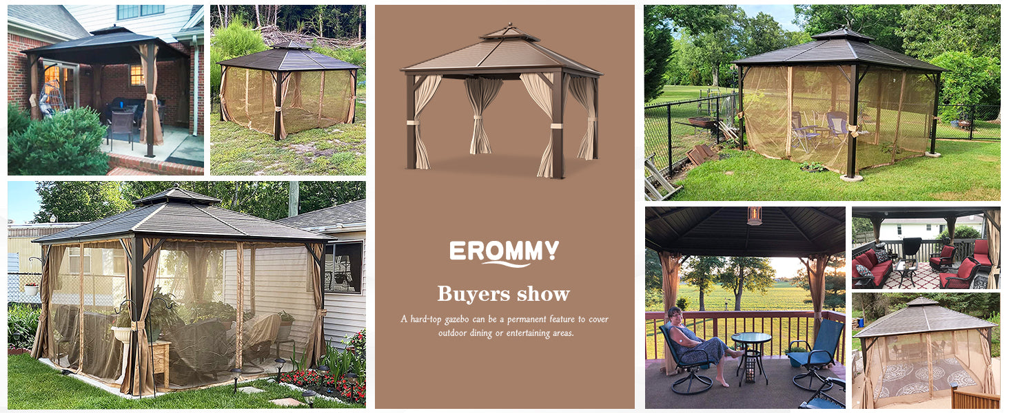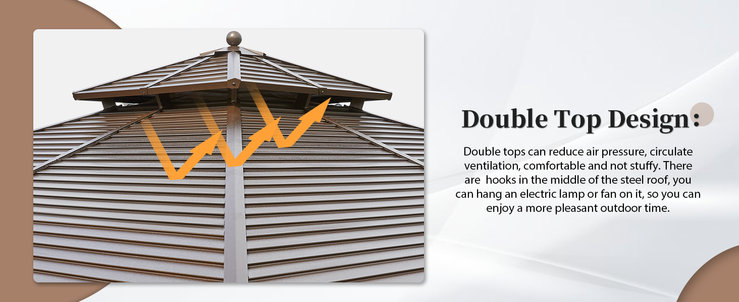 - 【DOUBLE TOPS DESIGN】- Outdoor gazebo has ventilated double tops provide safety from harmful UV rays while the unique design allows wind to pass through.Hardtop gazebos for patios can tolerate high summer temperatures and withstand UV rays,provides you plenty of cool shade to enjoyment.
