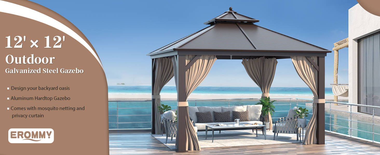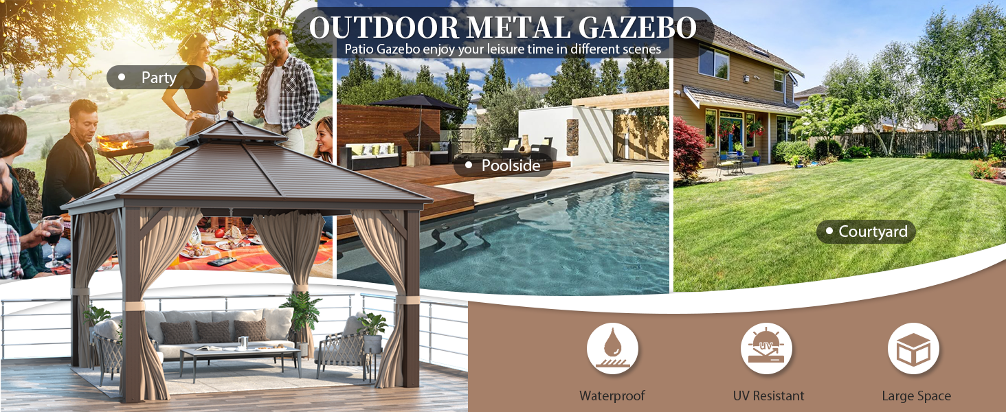 - 【GALVANIZED STEEL ROOF】- Beautiful hard metal top instead of normal fabric or polycarbonate material.Compare to a traditional soft top,this kind of gazebo roof is strong enough to withhold any heavy snow and offer unbeatable stability in windy conditions.
