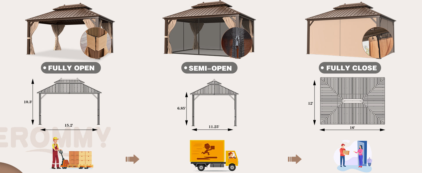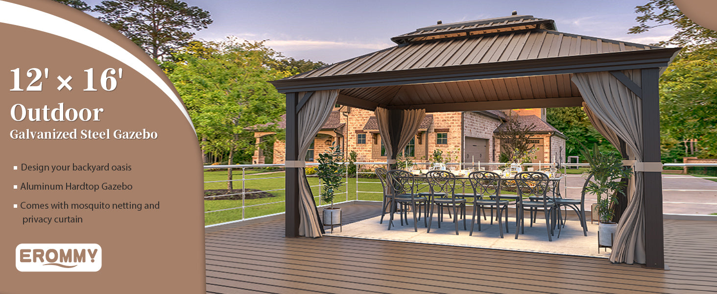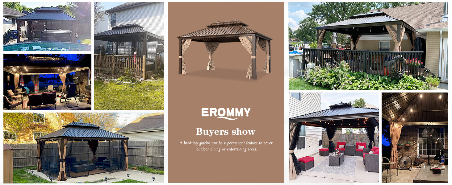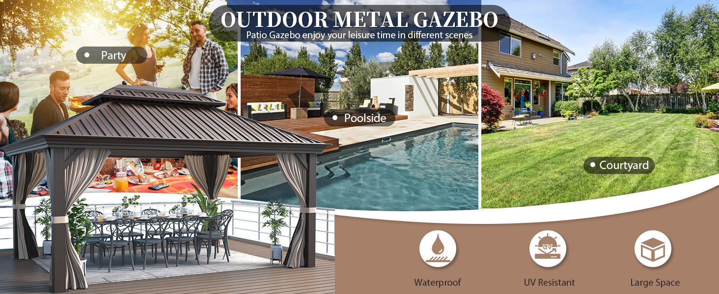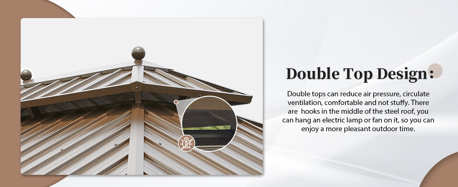 - 【GALVANIZED STEEL ROOF】- Beautiful hard metal top instead of normal fabric or polycarbonate material.Compare to a traditional soft top,this kind of gazebo roof is strong enough to withhold any heavy snow and offer unbeatable stability in windy conditions.