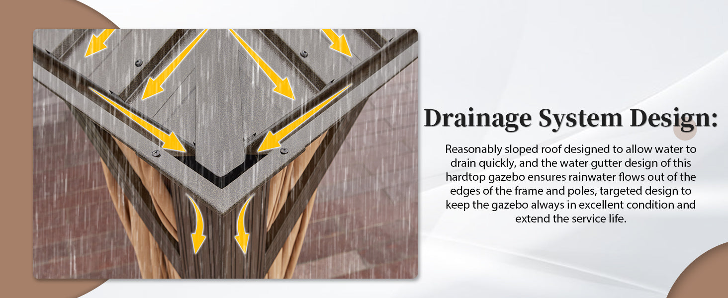- 【WATER GUTTER DESIGN】- Unique design allows rainwater to flow from the edge of the aluminum Gazebo top frame into the pole and then to the ground.Reduce troubles and worries during the rainy season.Targeted design to keep the gazebo always in excellent condition and extend the service life.