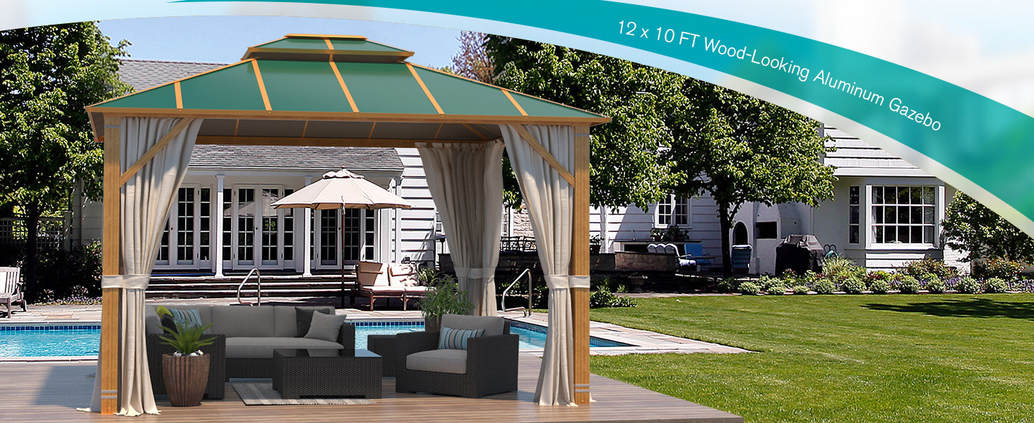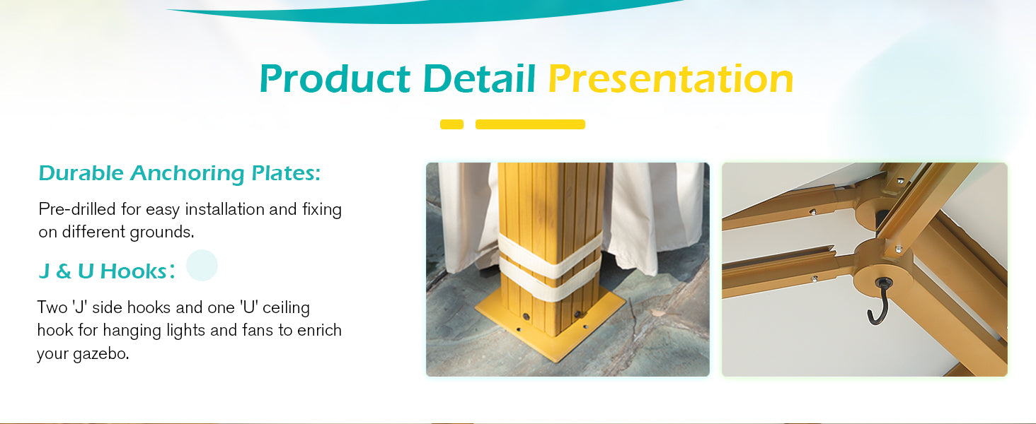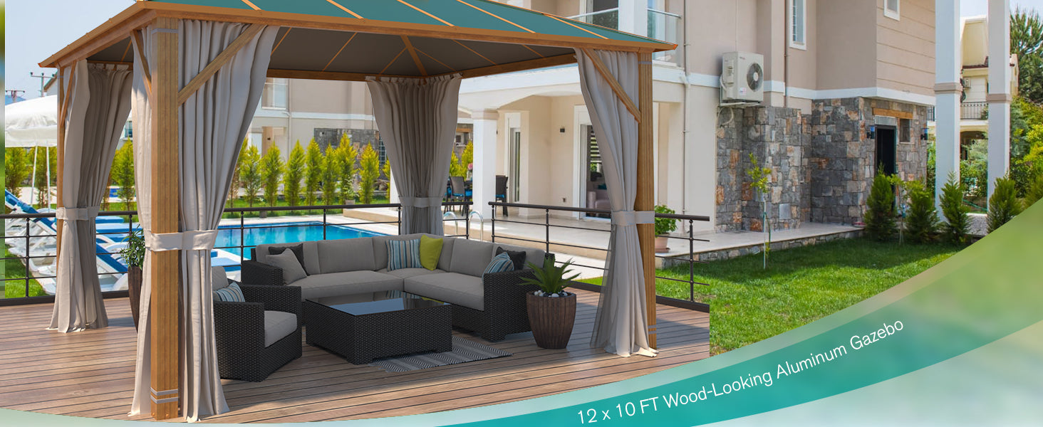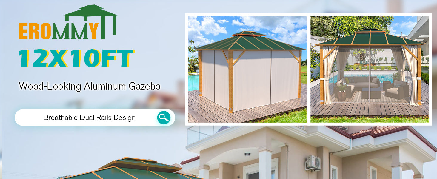 - 【Aluminum Composite Panel 】The patio gazebo uses high-end aluminum-plastic material as our panel. Compared with the ordinary galvanized steel roof, this material can block strong light and 99% harmful ultraviolet rays, can effectively block the high temperature in sunny days and ensure the sound insulation effect when it rains. The perfect aluminum composite panel has enough strength to withstand heavy snow and well cope with various weather conditions.