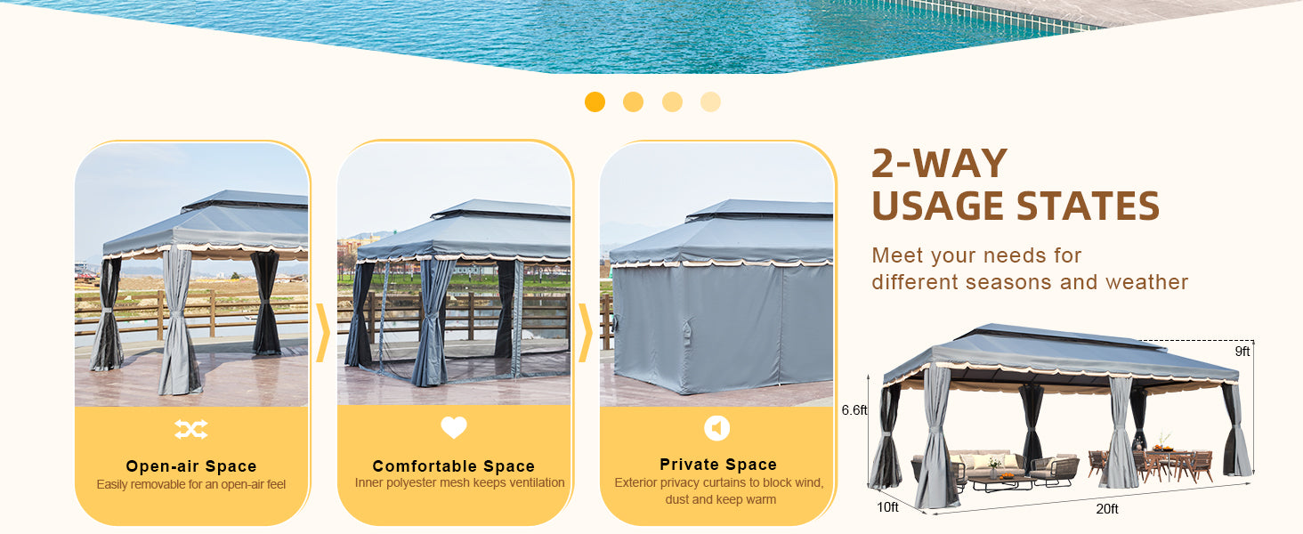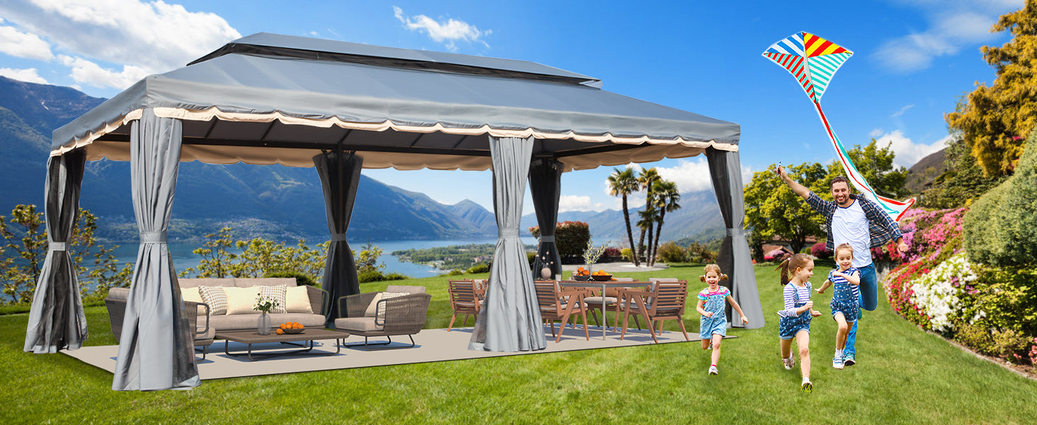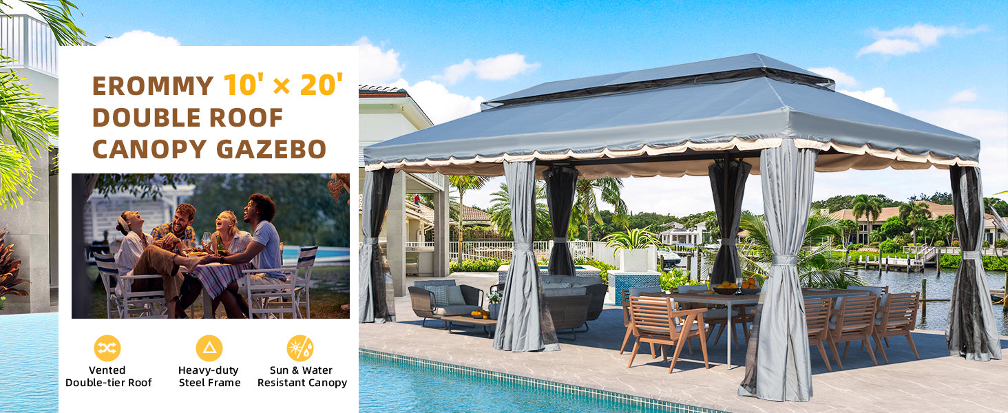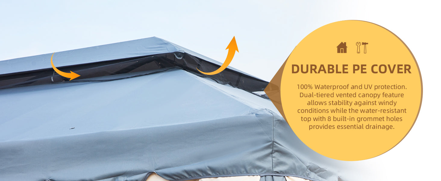 - 2 TIER VENTED DESIGN: With a reinforced double-tier roof, this outdoor gazebo promotes proper airflow while effectively shielding against rain and wind, ensuring a comfortable environment underneath.