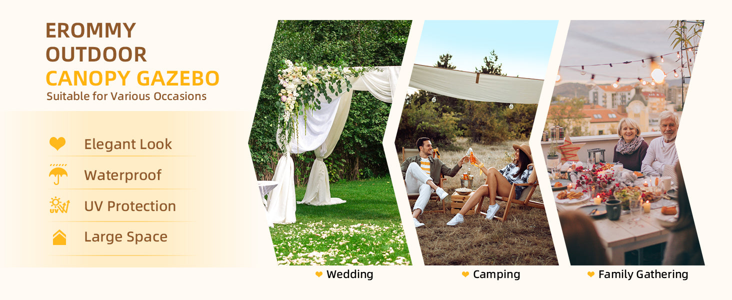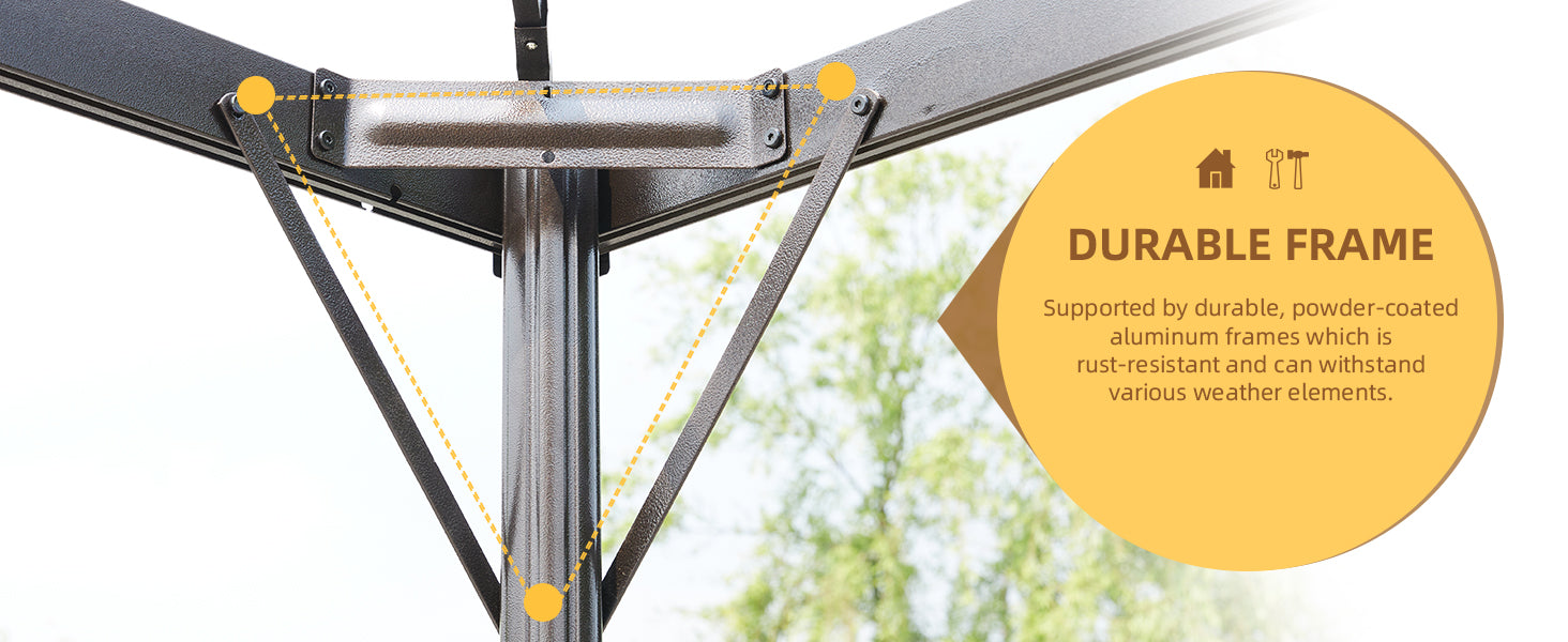 - DURABLE FRAME & PREMIUM DESIGN: The gazebo features a powder-coated, rust-resistant aluminum and steel frame, ensuring rugged durability for long-lasting use. Its sturdy construction provides a reliable shelter for guests, while the water-resistant top with built-in grommet holes ensures essential drainage.