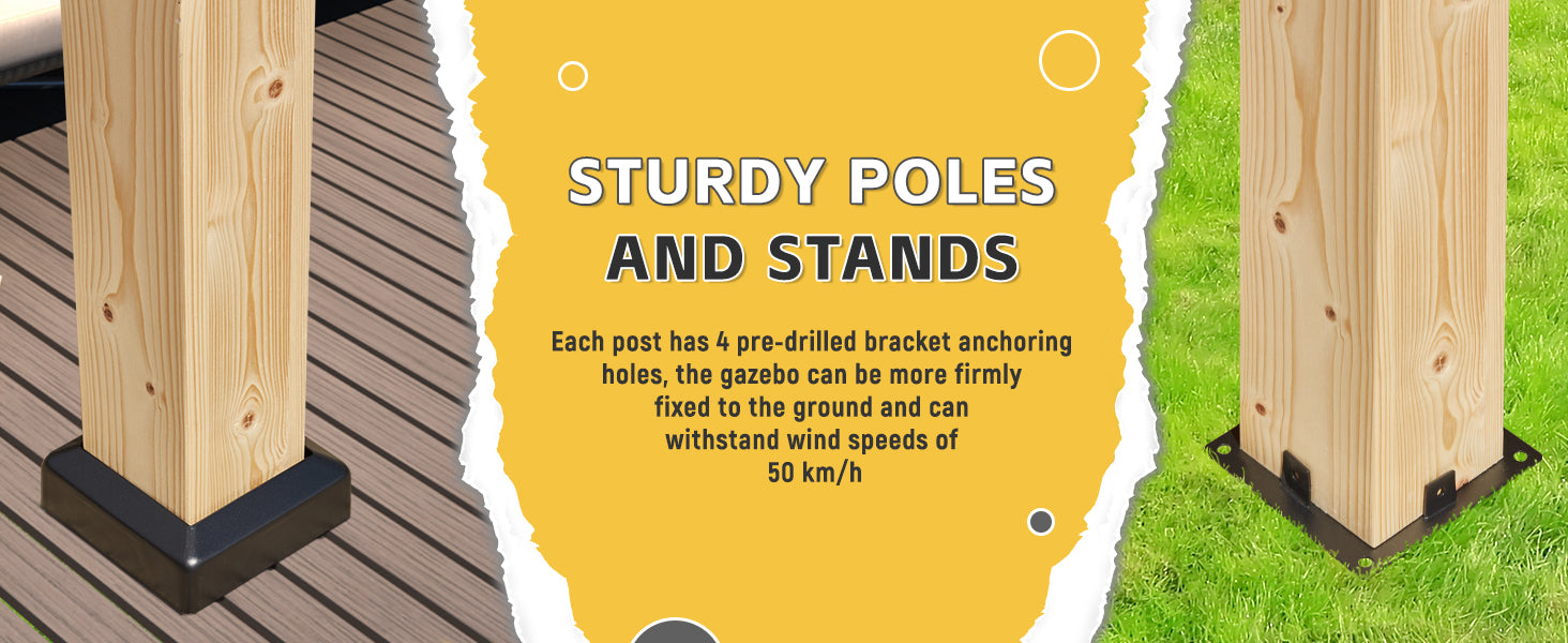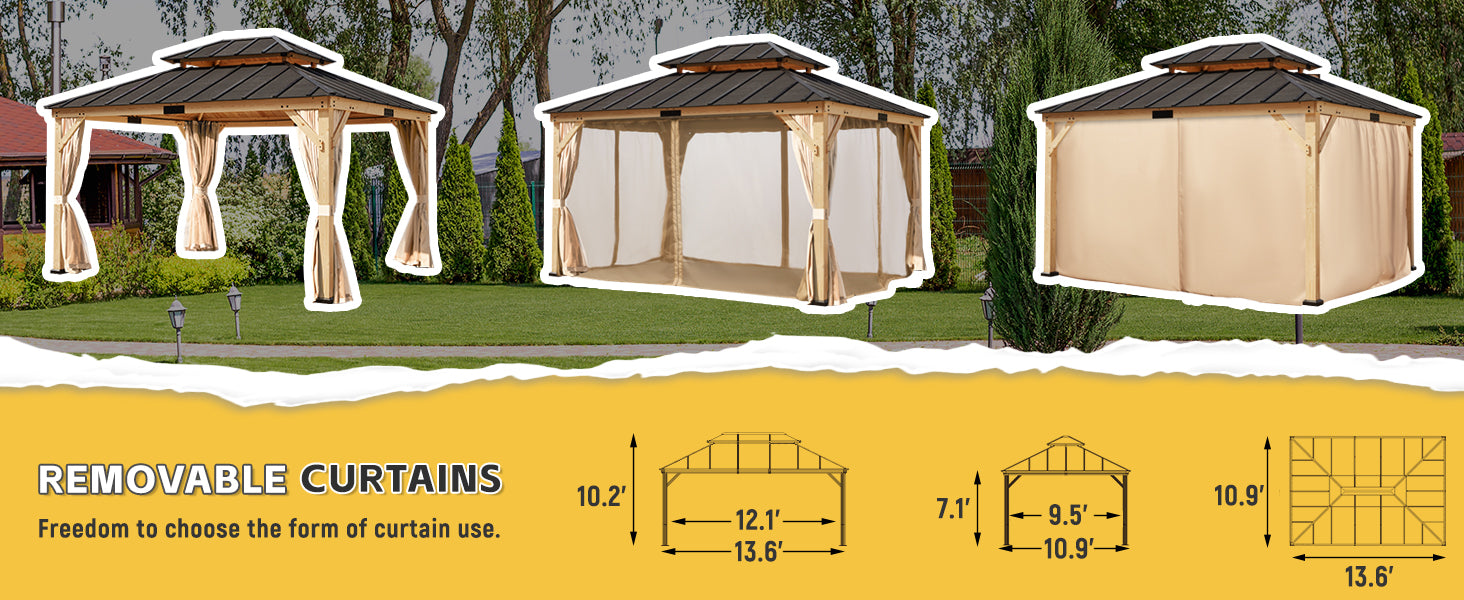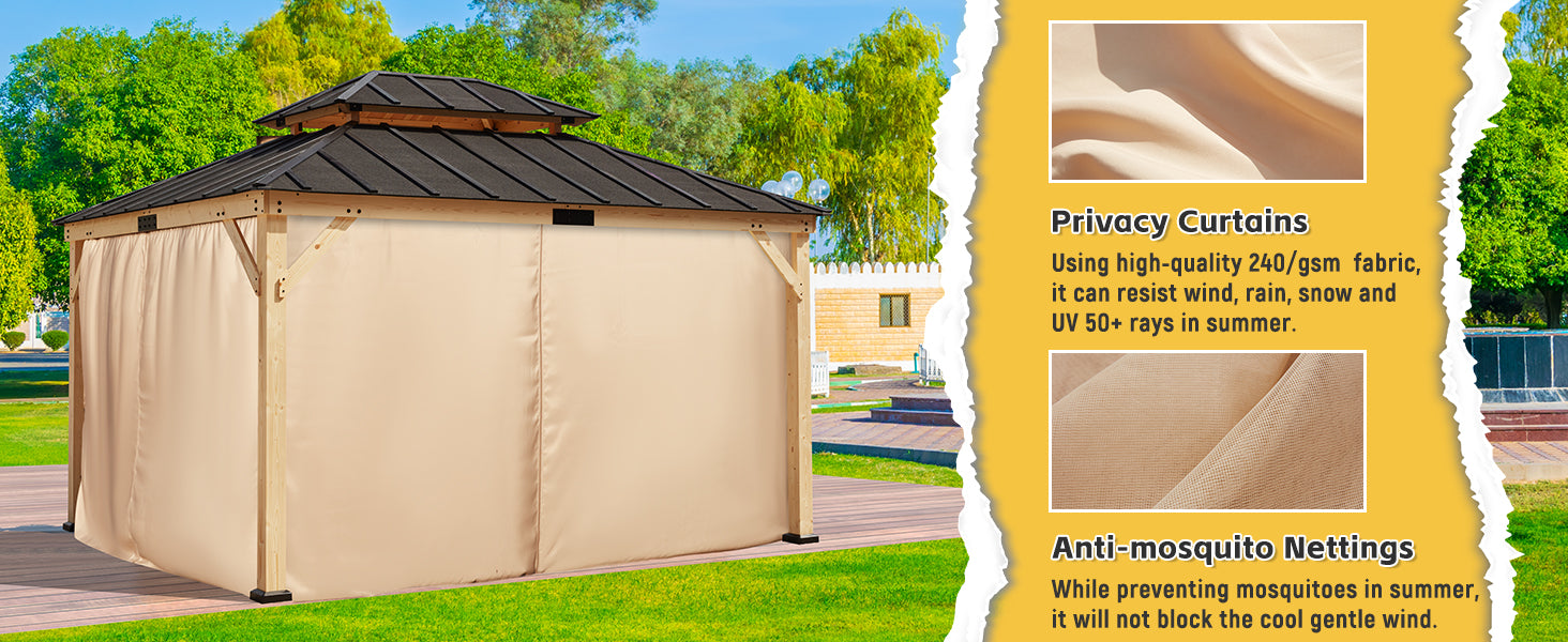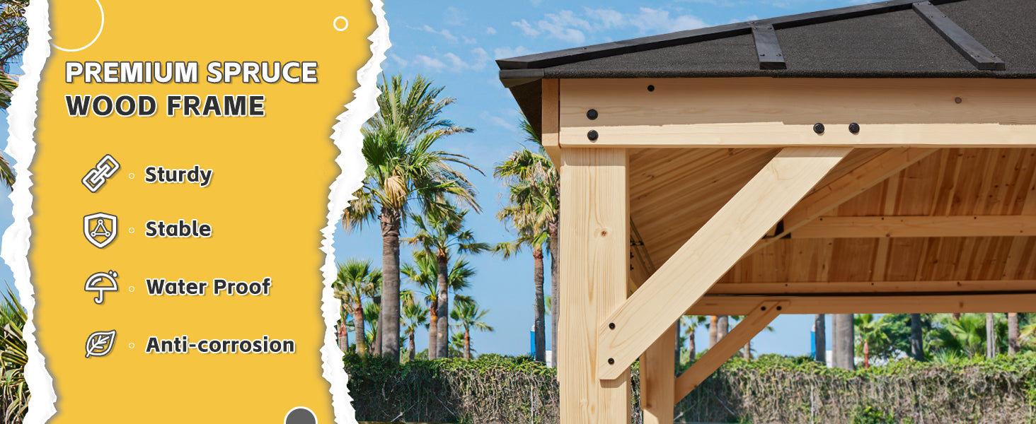 - ☀️【Natural Spruce Material】- Made from premium spruce wood, our patio gazebo retains its original wood texture while also being treated with oil immersion and coating to resist corrosion, rain, snow, and wind. This increases the life and stability of the wood, making it a durable choice for outdoor use