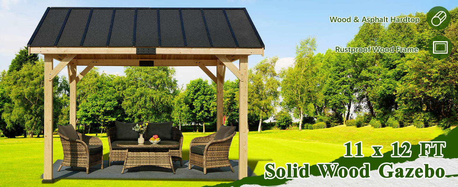 • 11‘ x 12‘ Hardtop Gazebo, Solid Spruce Wood Gazebo with Waterproof Asphalt Roof, for Lawns, Beach, Patio, Garden