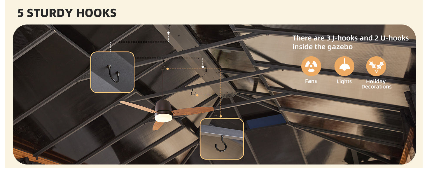 - 【Thoughtful Details】- The triangular structure of the columns of this 12x20 gazebo can make the whole gazebo more stable, and the wider anchoring base can better fix the columns so that the gazebo will no longer be afraid of wind and other bad weather. The interior of the double-roof gazebo also comes with 3 J-hooks and 2 U-hooks, which can be used to hang lights, fans, or some holiday decorations, creating a more comfortable outdoor leisure space for you.