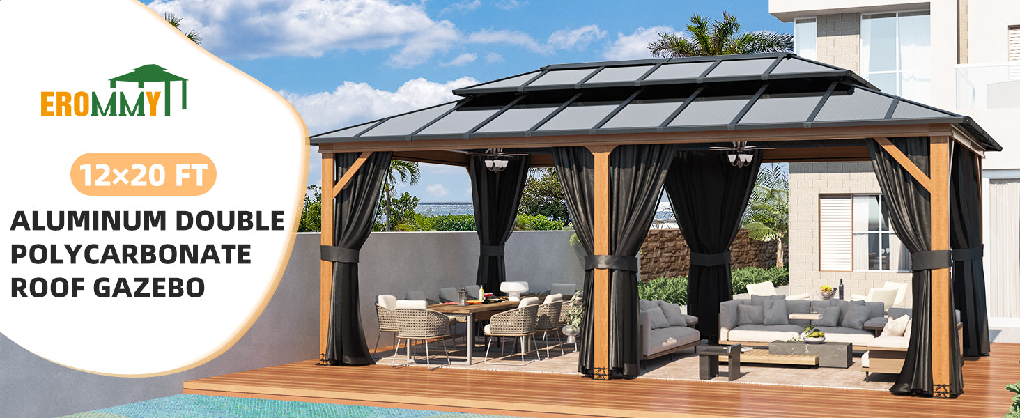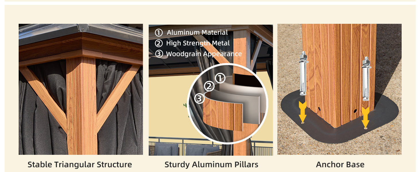 - 【High-Quality Selection of Materials】- The roof of this gazebo for patios is made of polycarbonate, which is not only waterproof but also can reflect UV rays, the thickened polycarbonate panel is not easy to break and can be used for a long time. The frame of the outdoor hardtop gazebo is made of high-quality aluminum and iron alloy, which does not easily rust and will not crumble, and the outer layer of the columns is made of wood grain treatment, which looks more beautiful and fashionable.