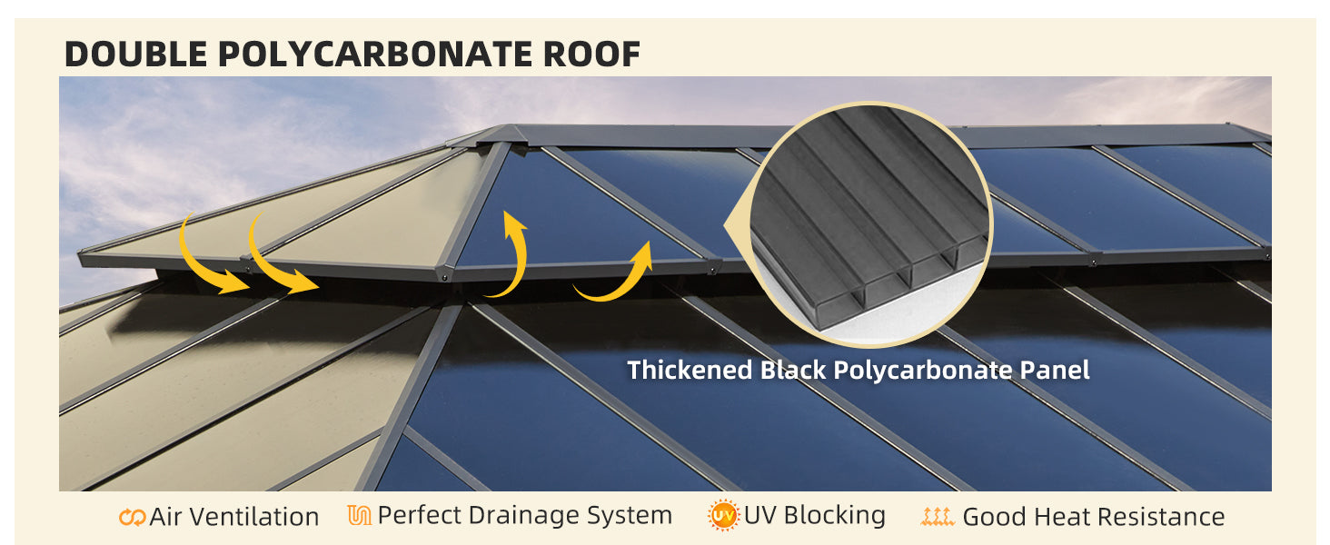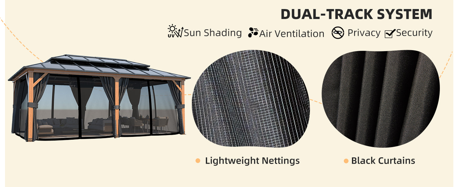 - 【Double Track System】- The polycarbonate roof gazebo comes with curtains and nettings that slide independently, so you can choose whether to put them down or not according to your needs. The lightweight nettings can keep out while ensuring ventilation. The waterproof curtains not only shade the sun but also give you a private outdoor space that is guaranteed to be undisturbed. The curtains come with two tiebacks to organize them nicely.