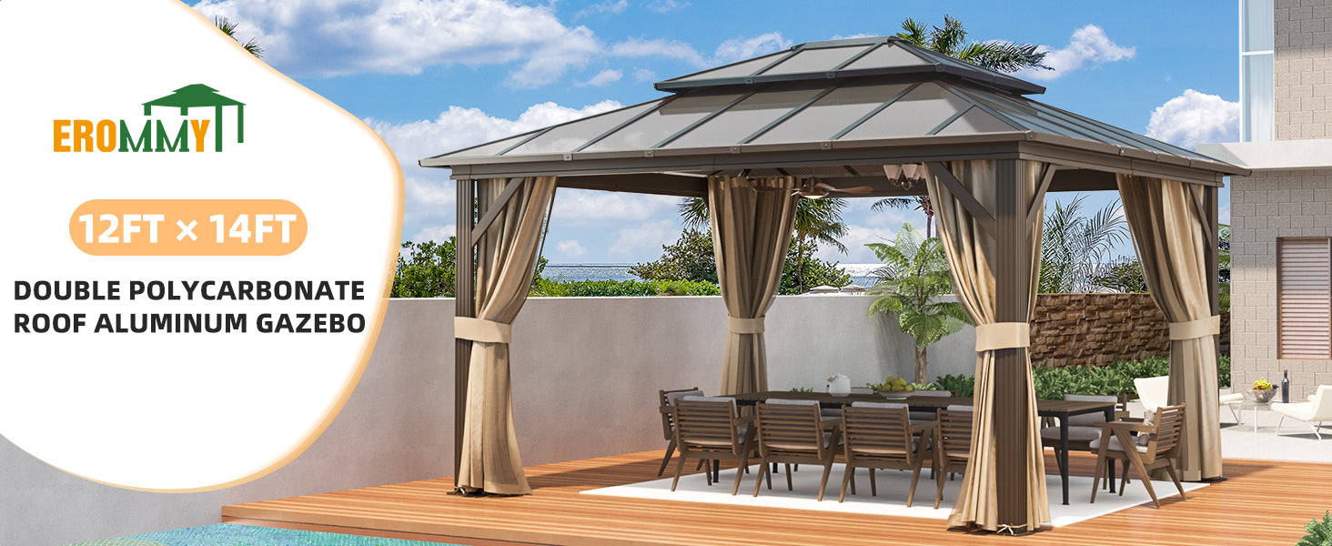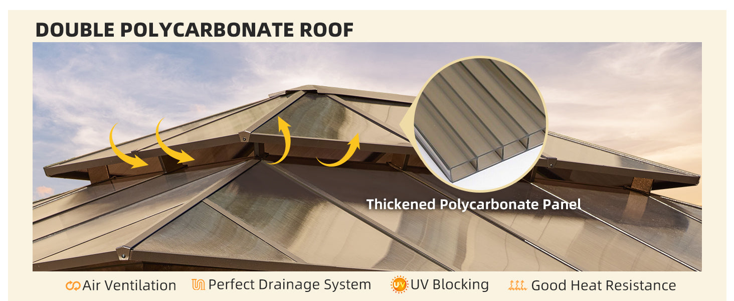- 【Multi-Weather Application】-The polycarbonate roof of this aluminum hardtop gazebo can effectively reflect 99% of UV rays and achieve a waterproof effect, and the tilted outwardly extending roof can achieve fast and perfect drainage, so that the rain, snow, and leaves will not pile up on the roof, which will reduce the pressure of cleaning, and will not dampen the furniture inside the double roof gazebo. The sturdy and stable frame structure also allows the gazebo to be unaffected on windy days.