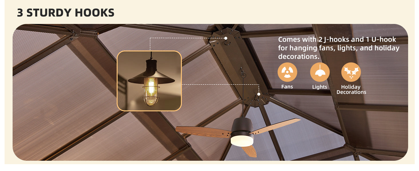 - 【Comfortable Enjoyment】- This gazebo for patios features a double-roofed structure that can be used to provide optimal ventilation and comfort. The 2 J-hooks and 1 U-hook on the roof of the canopy can be used to hang fans, lights, and holiday decorations, creating a warm and cozy outdoor space for all seasons and all times of the year.