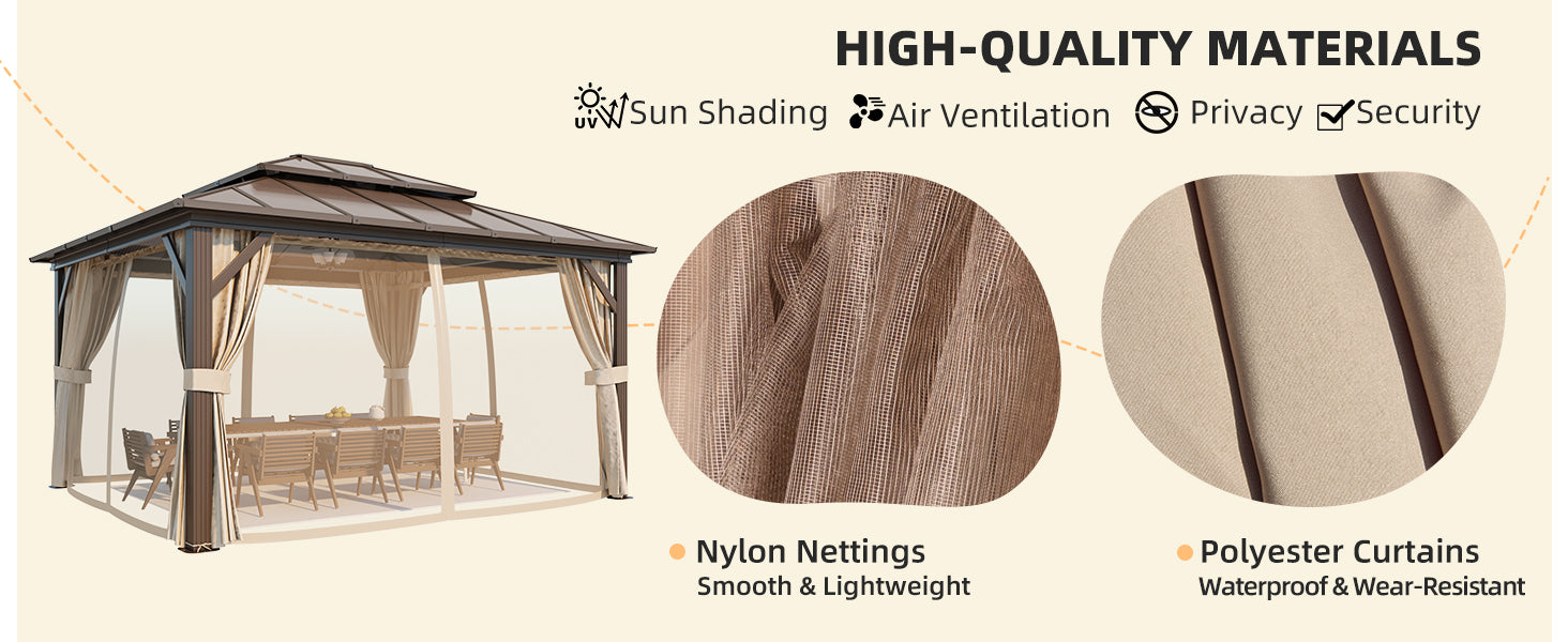 - 【Curtain & Netting】- This outdoor hardtop gazebo comes with netting and curtains that open and close on all four sides for easy access and to adjust your own lighting needs. The netting can keep out while ensuring ventilation, and the curtains can effectively shade the sun and also provide undisturbed privacy. The gazebo with curtains has two ties on each curtain to keep the curtains well organized without having to worry about them flapping in the wind.