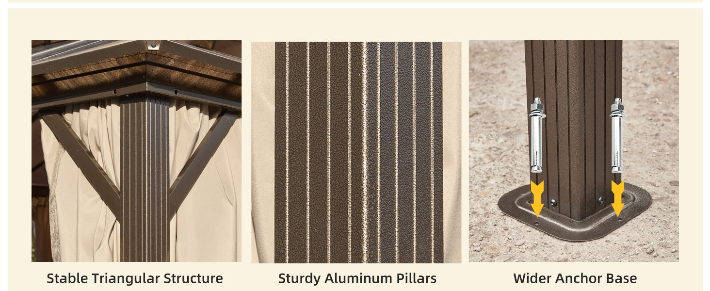 - 【Safe and Secure】-This patio gazebo is made of an upgraded aluminum frame, which is waterproof and at the same time not easy to rust, not easy to fade, will not break, and can support the whole gazebo well. The triangular structure at the top of each column can make the whole frame more stable, and the wider anchoring base at the bottom of the column plays a further role in fixing the hard top gazebo to easily cope with the impact of bad weather and ensure the safety of you and your family.