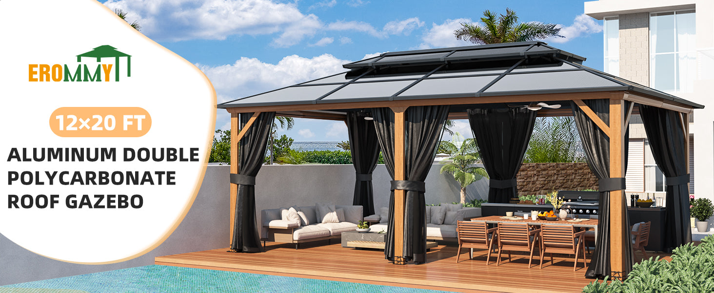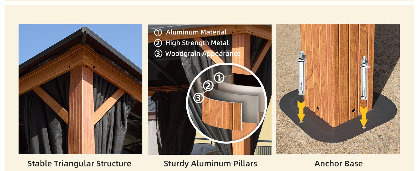 - 【High-Quality Selection of Materials】- The roof of this gazebo for patios is made of polycarbonate, which is not only waterproof but also can reflect UV rays, the thickened polycarbonate panel is not easy to break and can be used for a long time. The frame of the outdoor hardtop gazebo is made of high-quality aluminum and iron alloy, which does not easily rust and will not crumble, and the outer layer of the columns is made of wood grain treatment, which looks more beautiful and fashionable.