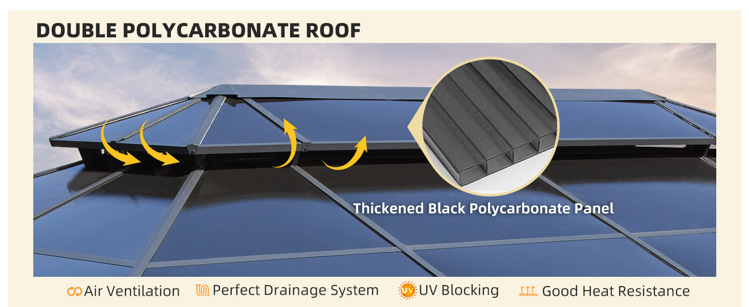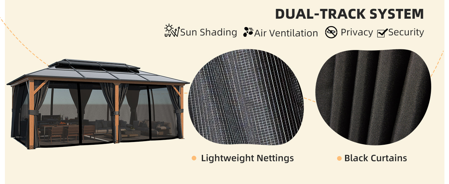 - 【Double Track System】- The polycarbonate roof gazebo comes with curtains and nettings that slide independently, so you can choose whether to put them down or not according to your needs. The lightweight nettings can keep out while ensuring ventilation. The waterproof curtains not only shade the sun but also give you a private outdoor space that is guaranteed to be undisturbed. The curtains come with two tiebacks to organize them nicely.