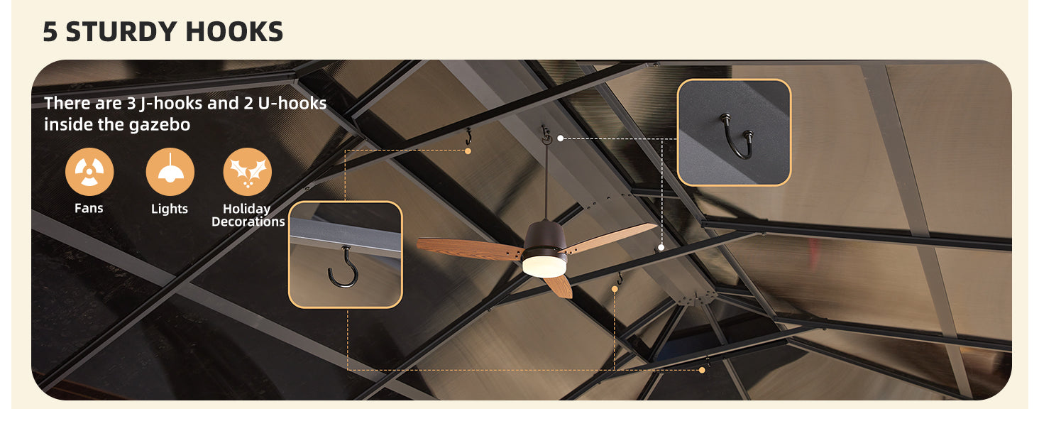 - 【Thoughtful Details】- The triangular structure of the columns of this 12x20 gazebo can make the whole gazebo more stable, and the wider anchoring base can better fix the columns so that the gazebo will no longer be afraid of wind and other bad weather. The interior of the double-roof gazebo also comes with 3 J-hooks and 2 U-hooks, which can be used to hang lights, fans, or some holiday decorations, creating a more comfortable outdoor leisure space for you.
