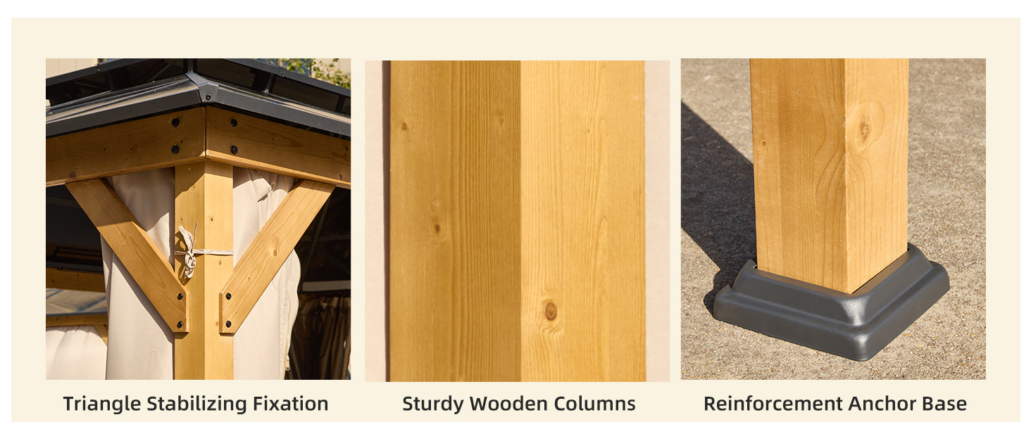- 【Sturdiness & Comfort】This patio gazebo is a polycarbonate roof gazebo, which can block sunlight rain, and snow very well. The wooden columns and reinforced base as well as the triangular reinforcing poles of the columns will make the gazebo more stable and not easy to shake, and you won't have to worry about damage for a long time to come. Meanwhile, the double roof gazebo also ensures good ventilation and the spacious 12' x 16' space can also accommodate 6-8 people comfortably in the gazebo at the same time.
