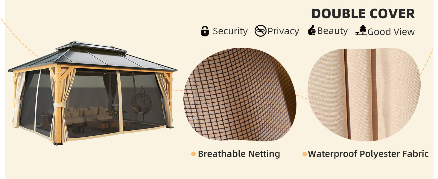 - 【Privacy & Security】Gazebo with curtains give you more options for outdoor entertaining. Curtains can protect your private space while shading you from the sun, allowing you to enjoy your private time. The netting ensures ventilation while keeping 🐞 out of the permanent gazebo, taking care of your and your family's health. The independently sliding curtains and netting can be easily pulled, and the four-side opening and closing design makes it easy to get in and out.