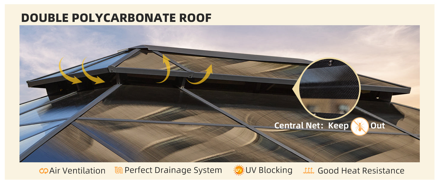 - 【Perfect drainage system】The inclined angle of this gazebos for patios coupled with the polycarbonate material ensures that rainwater flows down smoothly and does not allow rain, snow, and leaves to remain on the top of the gazebo, which prolongs the service life of the hard top gazebo as well as makes it more aesthetically pleasing to the eye and reduces the number of steps required for cleaning.