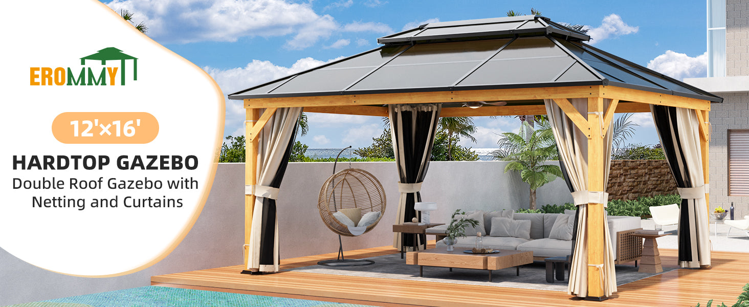 - 【Stylish and Beautiful】The unique combination of this gazebo wood and polycarbonate roof makes the gazebo more beautiful and fashionable, It can be easily adapted to your patio, pool, or backyard, and will be a bright landscape wherever it is. You can cool off, meet guests, talk with friends, and entertain in the gazebo hardtop.
