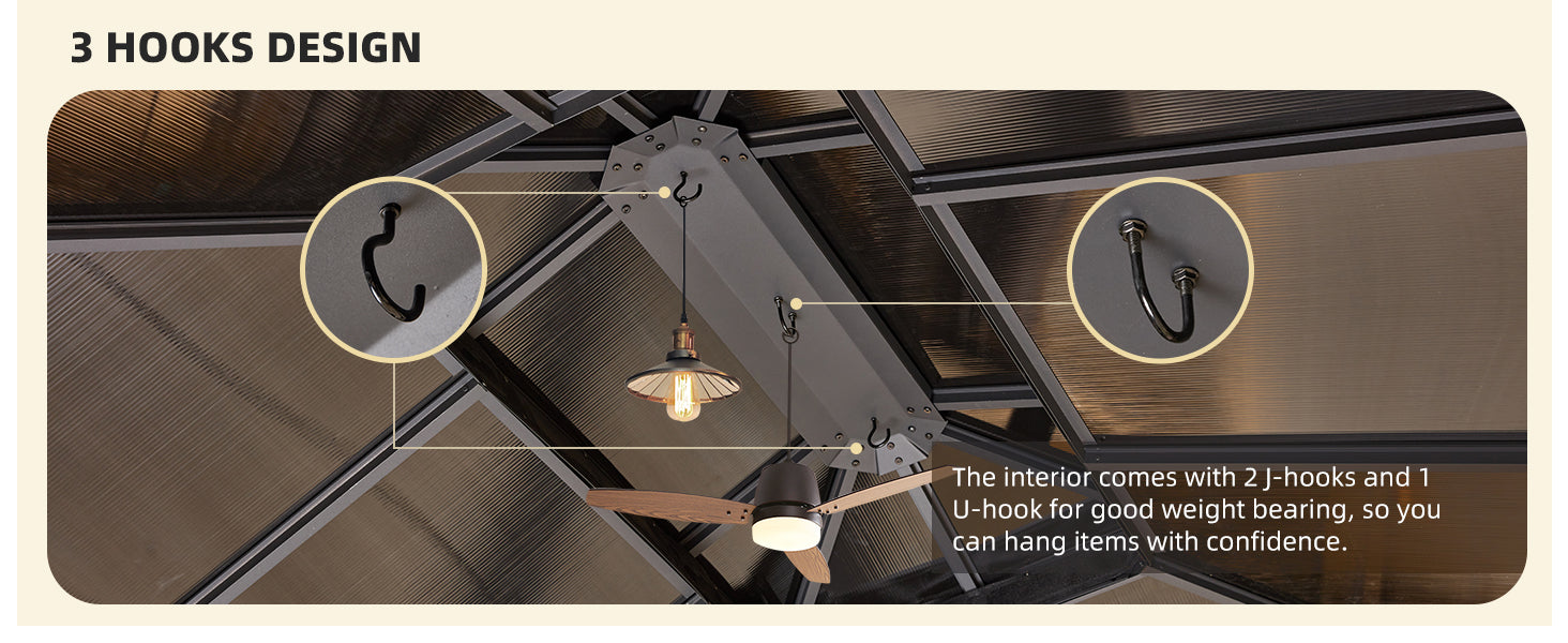 - 【Light Up Your Outdoor Patio】The top of this backyard gazebo offers two practical J-hooks and a sturdy U-hook, which can be used to hang lights, fans, etc., which will allow you to enjoy the outdoor hardtop gazebo in the evening and in the summer as well, and the three hooks also mean more versatility, so you can hang as many items as you want.T