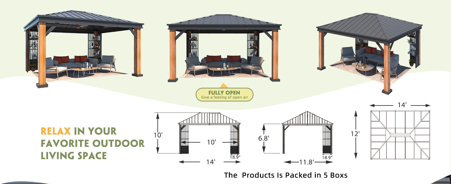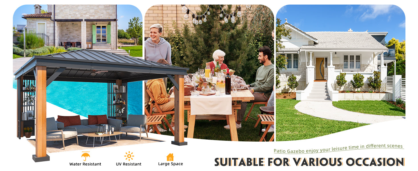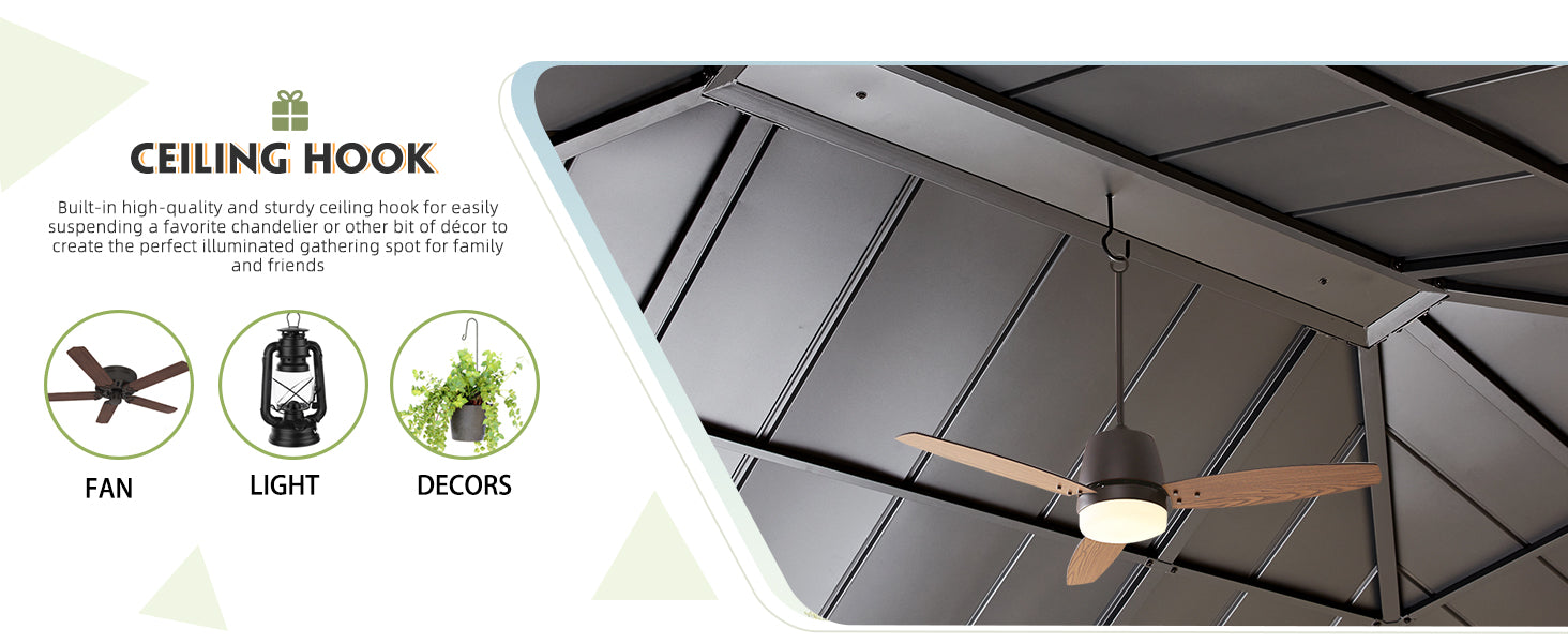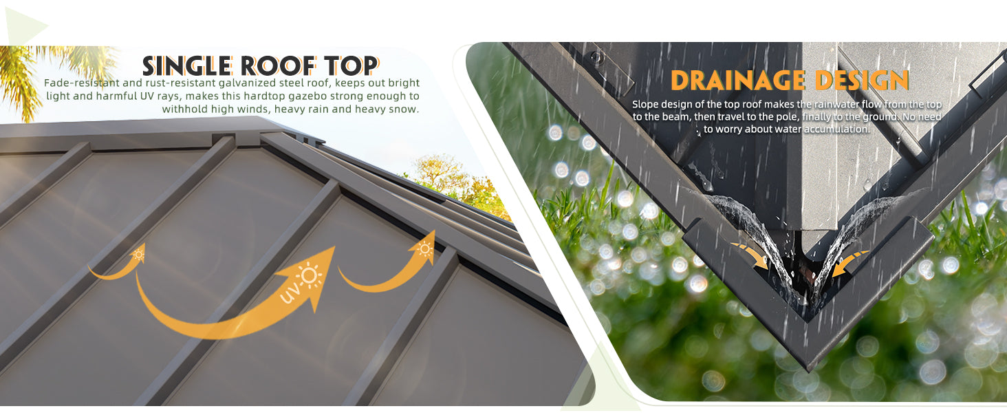 - GALVANIZED STEEL ROOF: Fade-resistant and rust-resistant galvanized steel top, keeps out bright light and harmful UV rays, makes this hardtop gazebo strong enough to withhold heavy snow and wind. The double-top design facilitates ventilation, cooling, and slowing down the wind speed, which could provide unmatched stability for your outdoor recreation.
