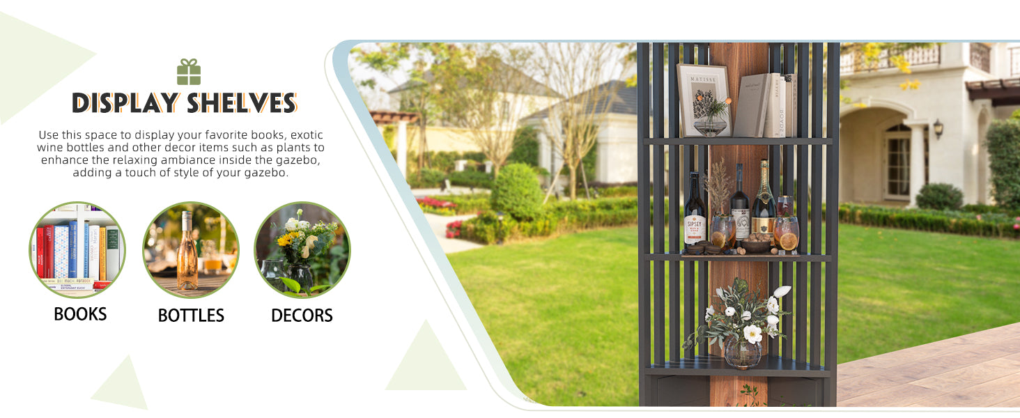 - CONVENIENT SHELF: The two pillars of outdoor gazebo have three-layer storage shelves, which provide a good space for storing drinks, snacks and other items. You can also place some decorations to enrich your outdoor garden life, like plants, books and etc.