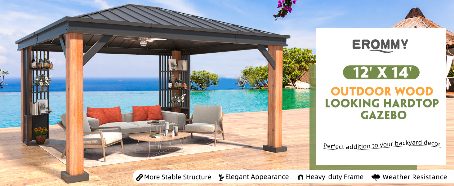 - WOOD GRAIN ALUMINUM FRAME: This outdoor gazebo is equipped with wood-looking powder coated, the real aluminum posts look like natural wood but are sturdy and durable enough for your outdoor use. The wooden-looking finish gazebo gives a natural feel that won't decay or crack like real wood or rust like the iron frame but last for many years.