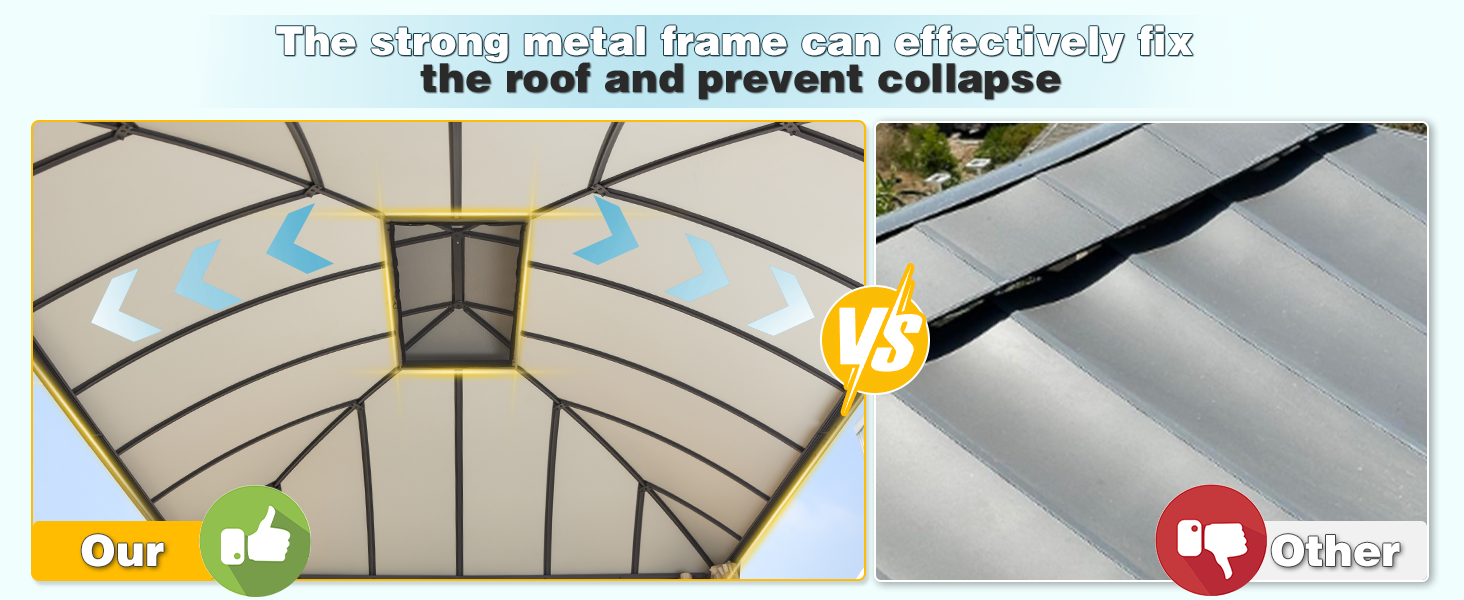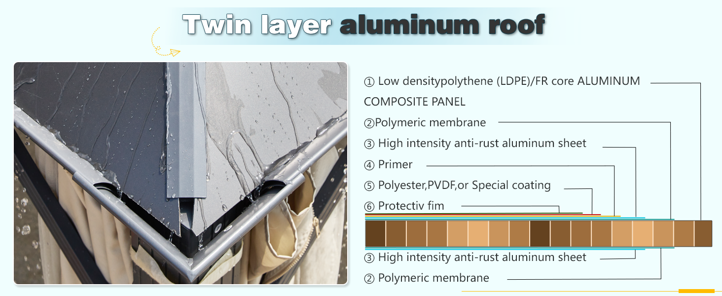 - 【Aluminum Composite Panel 】The patio gazebo uses high-end aluminum-plastic material as our panel. Compared with the ordinary galvanized steel roof, this material can block strong light and 99% harmful ultraviolet rays, can effectively block the high temperature in sunny days and ensure the sound insulation effect when it rains. The perfect aluminum composite panel has enough strength to withstand heavy snow and well cope with various weather conditions.