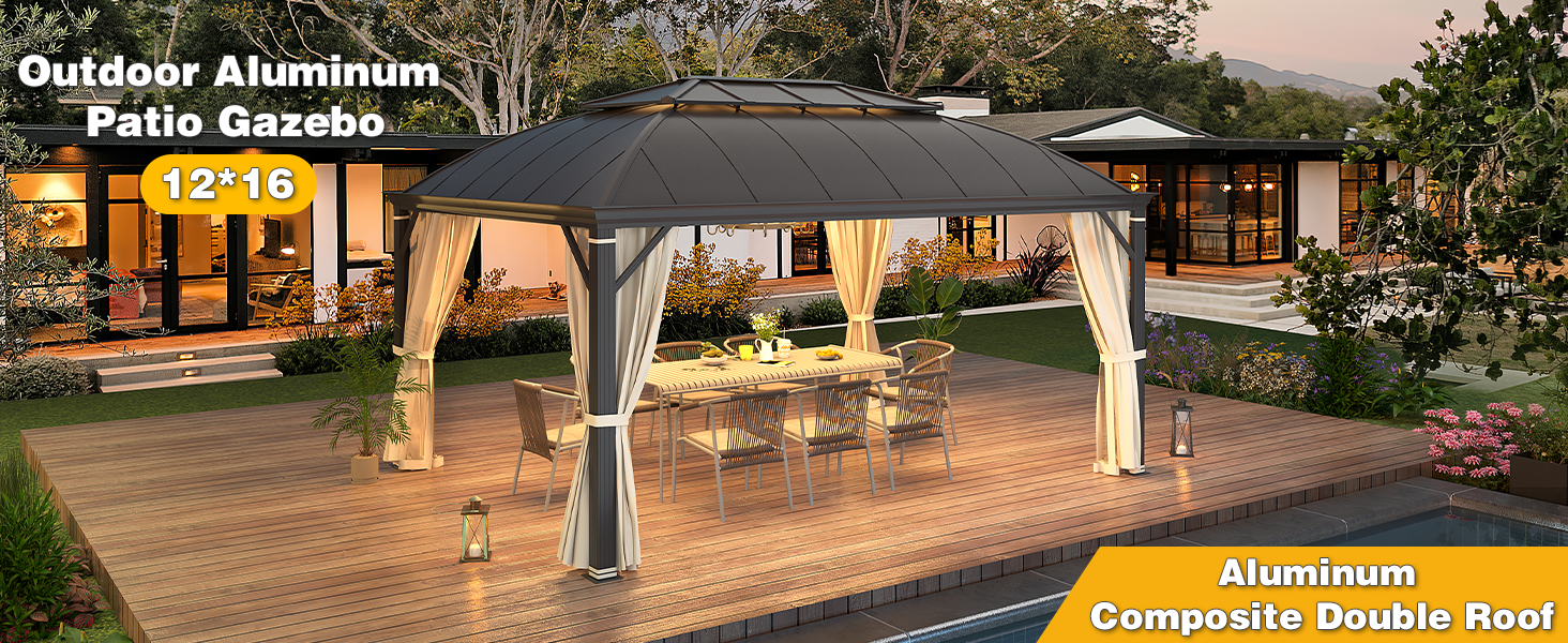 - 【Stylish and Functional】This gazebo for patios hard top is a great addition to any terrace, backyard, deck, lawn or garden! The space is spacious enough to hold a party for 7-9 people, providing a pleasant outdoor life experience for your family and friends.