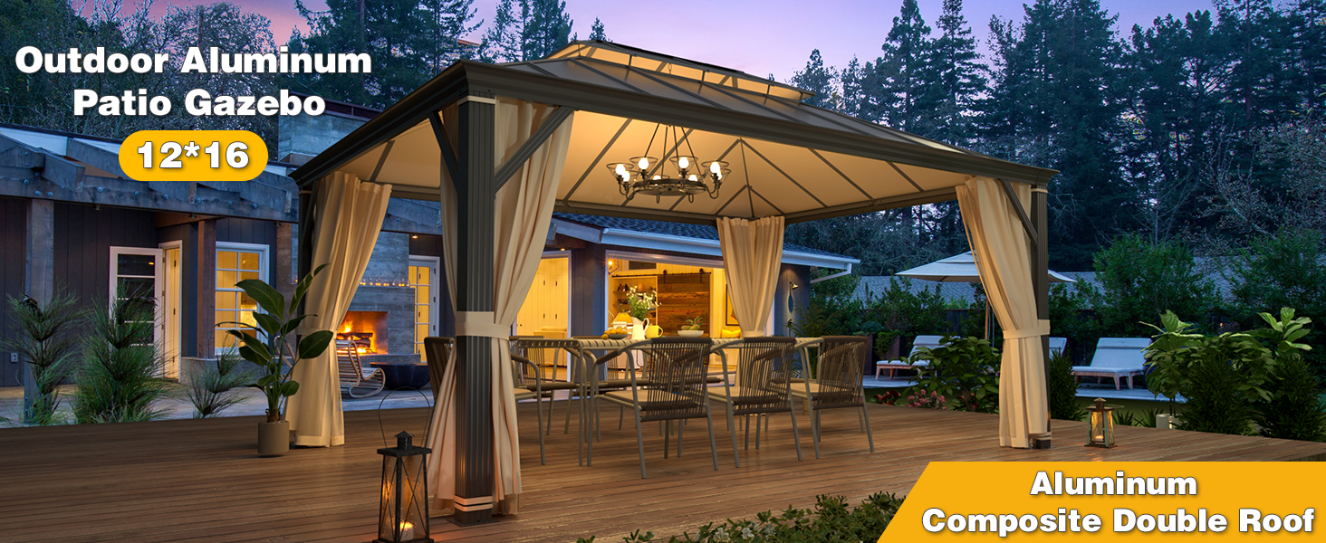 - 【Aluminum Composite Panel 】The patio gazebo uses high-end aluminum-plastic material as our panel. Compared with the ordinary galvanized steel roof, this material can block strong light and 99% harmful ultraviolet rays, can effectively block the high temperature in sunny days and ensure the sound insulation effect when it rains. The perfect aluminum composite panel has enough strength to withstand heavy snow and well cope with various weather conditions.