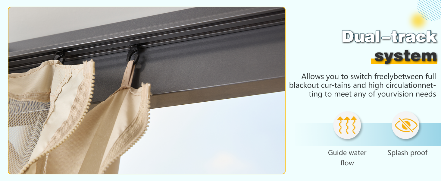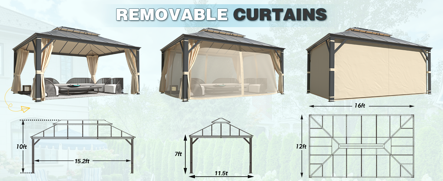 - 【Curtains & Nets】The hard top gazebo for patios is equipped with 4 privacy curtains and 4 net curtains with double-sided zippers. This user-friendly design can prevent mosquitoes, rain and ultraviolet rays. At the same time, under the premise of ensuring good ventilation, it also provides a safe and comfortable privacy space for your family.