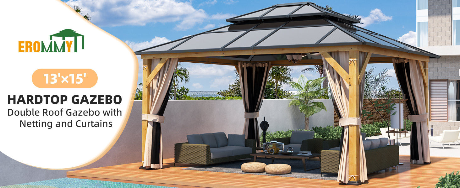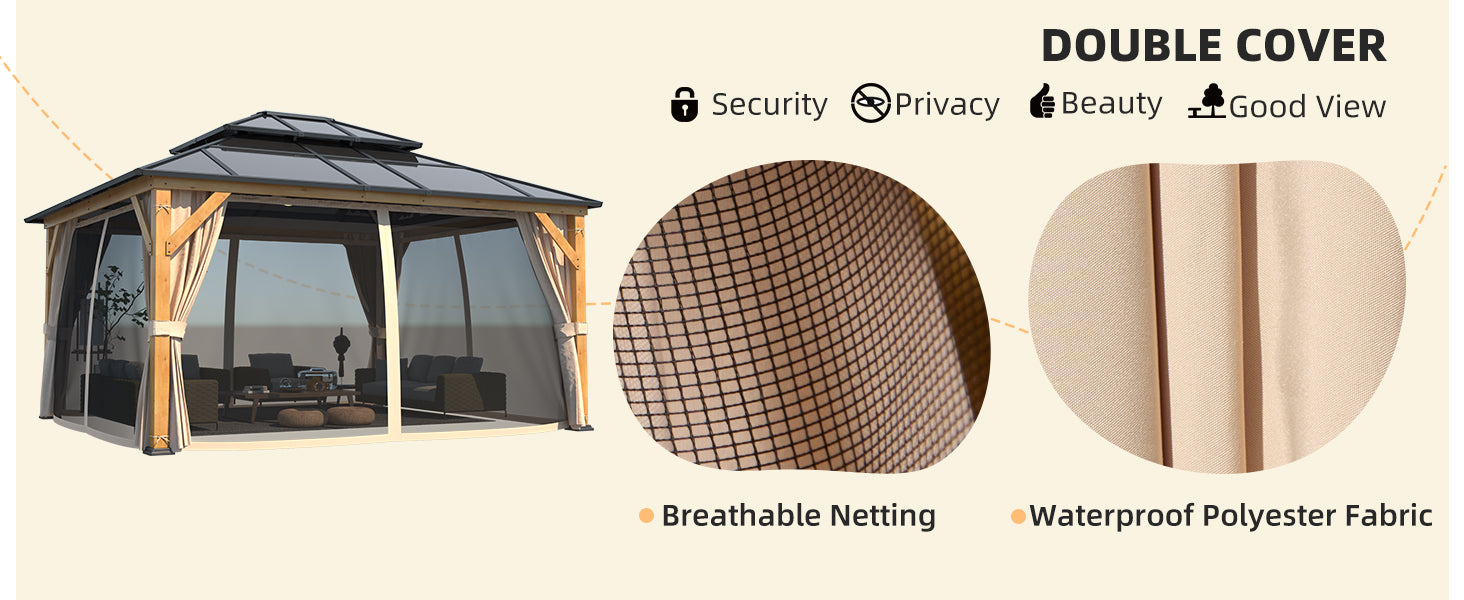 • 13' x 15' Hardtop Gazebo, Wood Outdoor Gazebo, Polycarbonate Double Roof, Netting and Curtains, Patio Gazebo