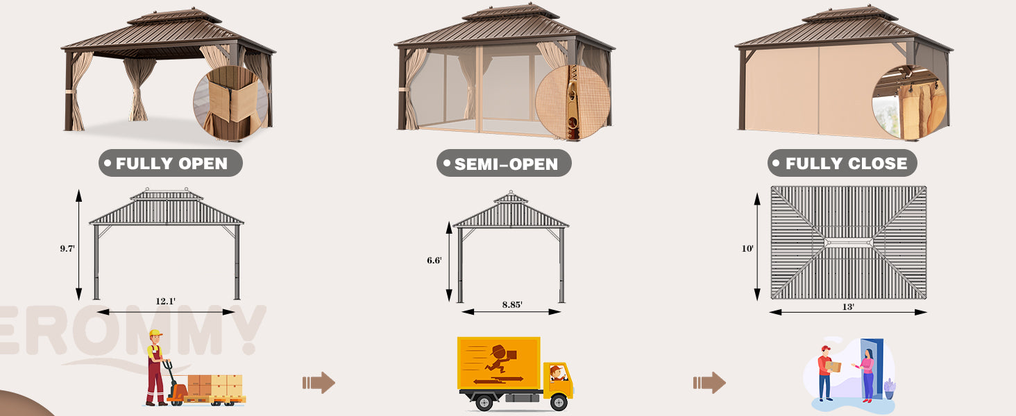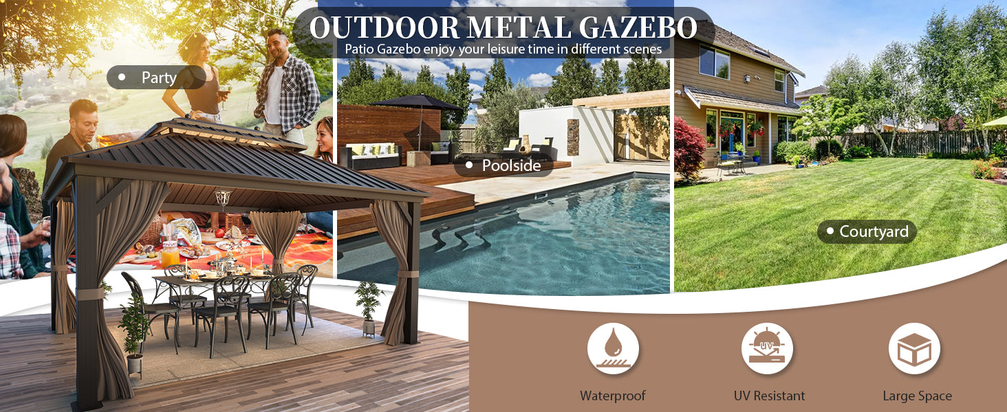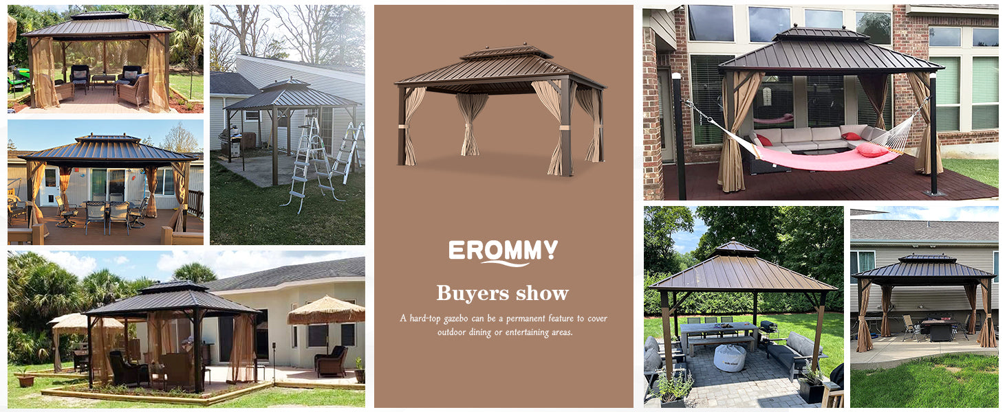 - 【VERSATILE USAGE】EROMMY patio gazebo provides 130 rectangle feet of coverage without feeling crowded.This heavy-duty gazebo provides you ample space to hold outdoor activities, such as picnics, BBQs, cook-outs, and get-togethers. Furthermore, the space allows you to enjoy time with your friends and family, creating memories for years to come.