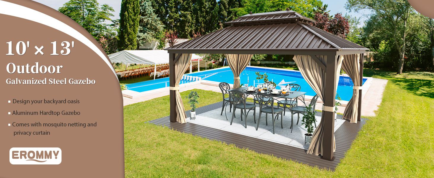 - 【GALVANIZED STEEL ROOF】Size: 10'X 13' Permanent Gazebo. Beautiful hard metal top instead of normal fabric or polycarbonate material.Compare to a traditional soft top,Galvanized steel metal top can withstand heavy snow, which provide you a privacy, safe and cool room.