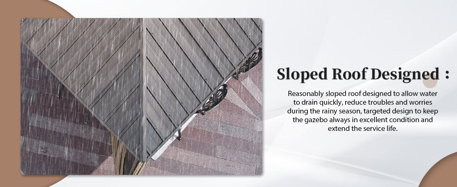- 【VENTED DOUBLE HARDTOP】Compared with one layer design, this double gazebo canopy allows sunlight to filter though and provides excellent airflow and the sloped roof allows rainwater to slide right off. Hardtop gazebos for patios can tolerate high summer temperatures and withstand UV rays,provides you plenty of cool shade to enjoyment.Finally, the interior hooks on the ceiling can be used for hanging the lamp or heater.