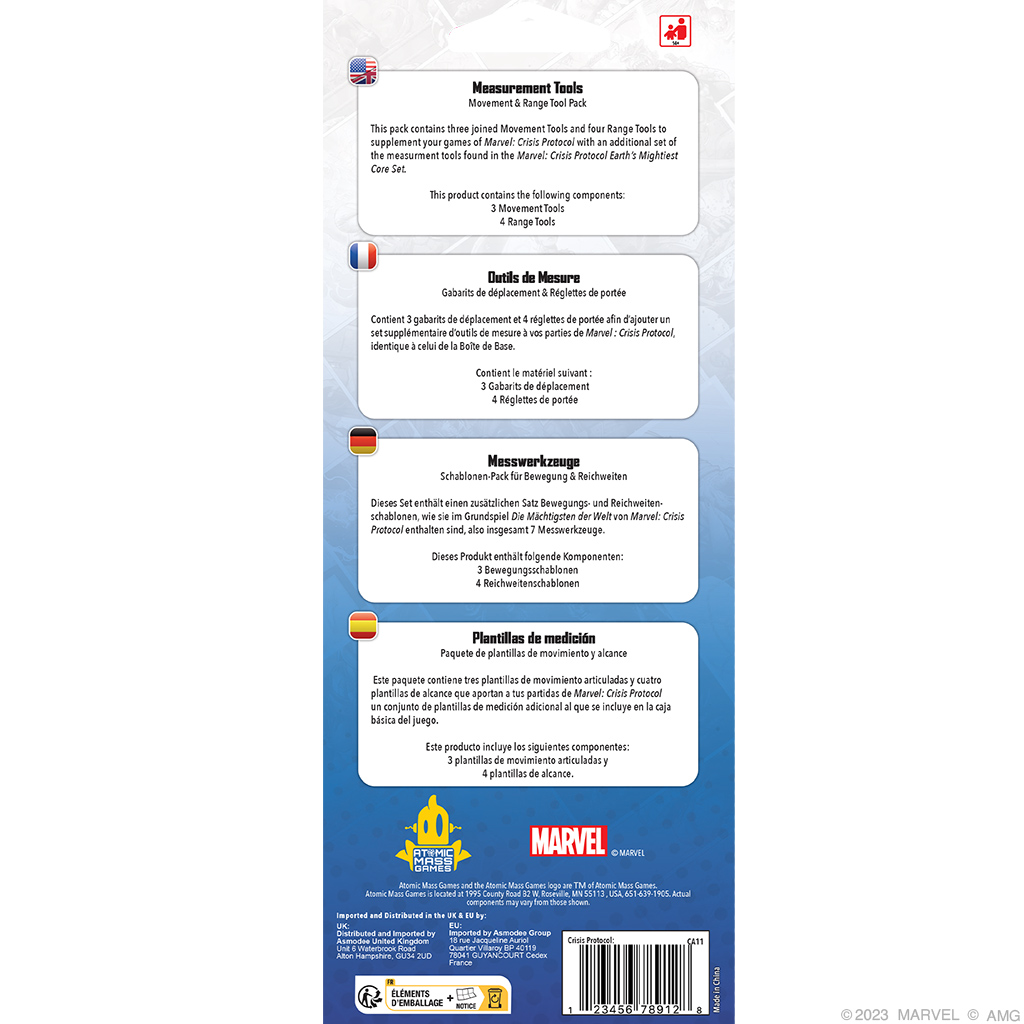 Players launch back into Marvel: Crisis Protocol with the revised measurement tools found in this pack! Featuring an additional 4 range tools and 3 movement tools, this pack replaces the measuring tools found in the CP03 Movement & Range Tool Pack with the updated tools also found in the Crisis Protocol Revised Core Set to ensure players have everything they need to make accurate measurements and movements.