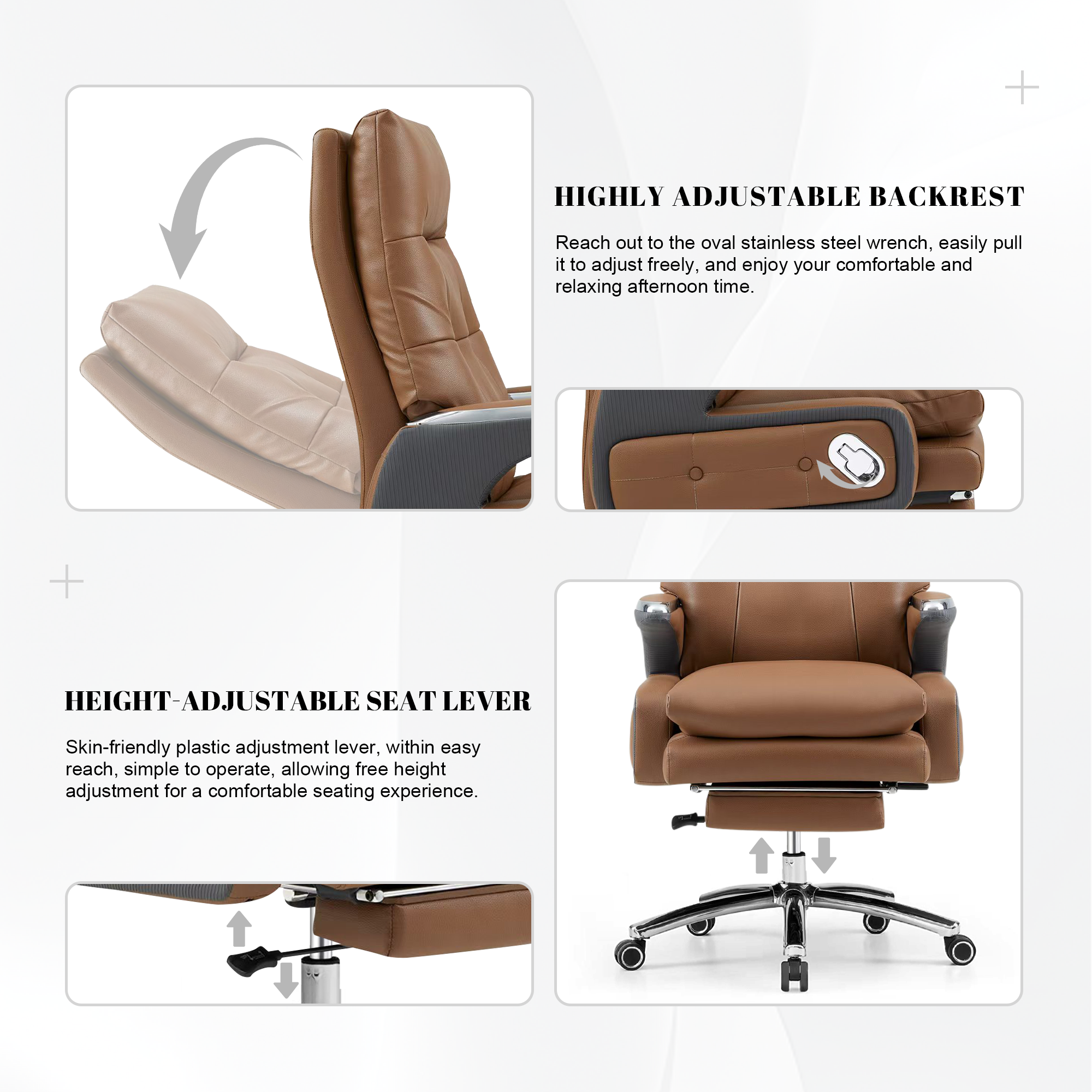 Multi-adjustable Design – Offers large-angle reclining, waist support adjustment, and seat height control, adapting to various usage scenarios like work or relaxation.