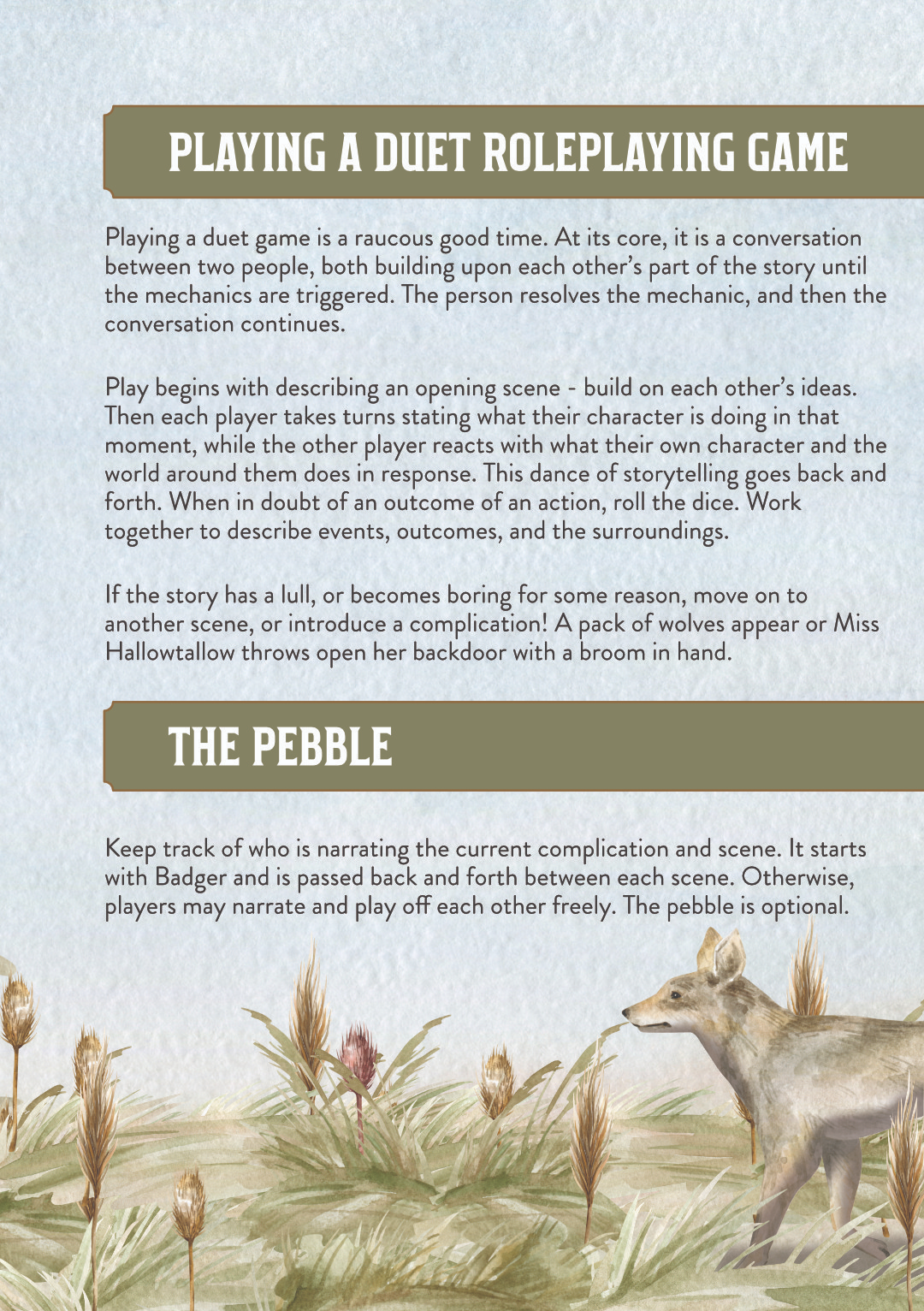 Badger + Coyote and their Daring Adventures is a cozy, asymmetrical, two-player TTRPG which contains: