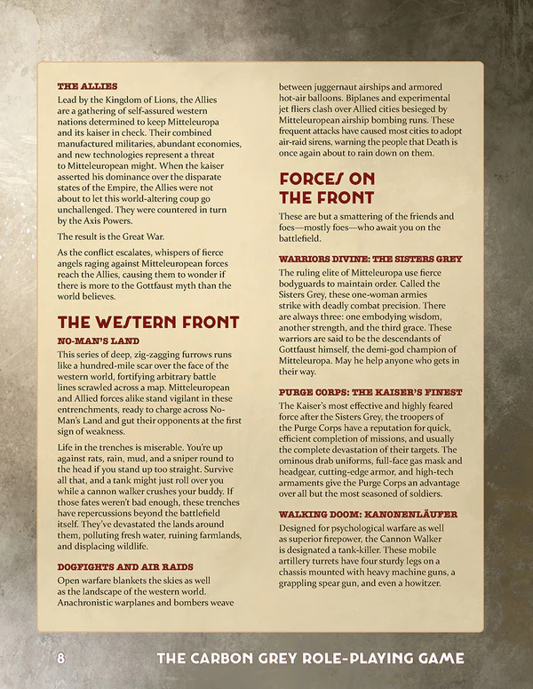 Survive the grimness of trench warfare. Dare to soar the deadly skies. Master the art of espionage to uncover the secrets of your enemies. Navigate the social hierarchy and underhanded dealings of both the nobility and the underworld. Learn to manipulate the strange powers that affect the very reality of the world around you. This is CARBON GREY.