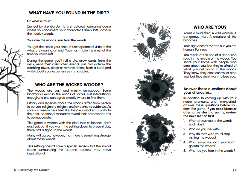 Carved by the Garden is a solo journaling game inspired by folk horror stories like The Witch, The Ritual, Midsommar, and those found in Damnable Tales: A Folk Horror Anthology. Featuring a sprawling forest as a backdrop, Carved by the Garden blends self-reflecting questions with unsettling and often bloody discoveries.
