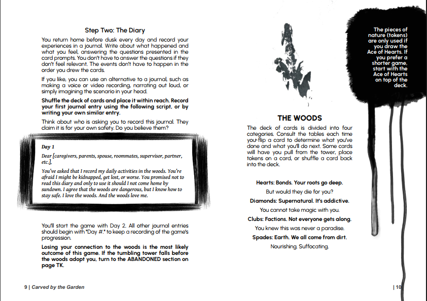 Document your character’s last days in the nearby haunted woods in Carved by the Garden, a single-player structured journaling game. Using a standard deck of playing cards, you’ll follow prompts that reveal the horrors waiting for you among the trees. You’ll also roll dice, pull blocks from a tumbling tower, and write about your experiences in character.