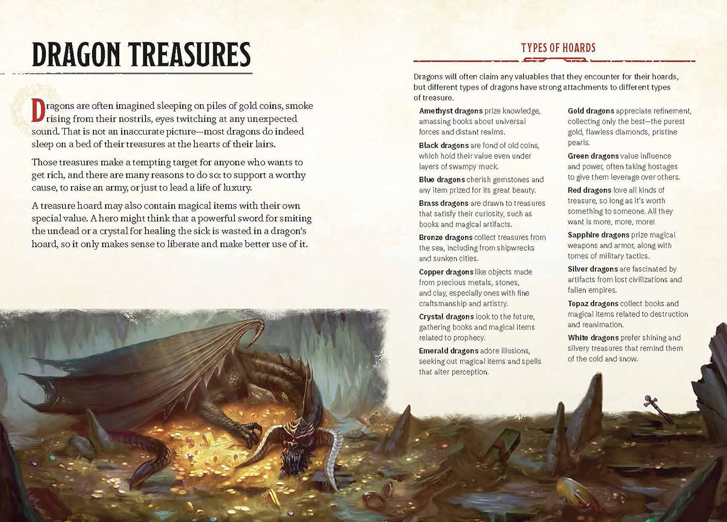 Dragons & Treasures transports new players to the magical world of Dungeons & Dragons and presents a one-of-a-kind course on the unique characteristics, fabled treasures, and wondrous artifacts of the most legendary of creatures: dragons! The book profiles all main dragon classes, and features easy-to-follow and entertaining explanations of how to identify and interact with these legendary beasts during your adventures. Advice, encouragement, and storytelling tips provide strategies for dealing with dragon encounters, hoards of treasure, and draconic artifacts, along with action-packed illustrations that will ignite your imagination.