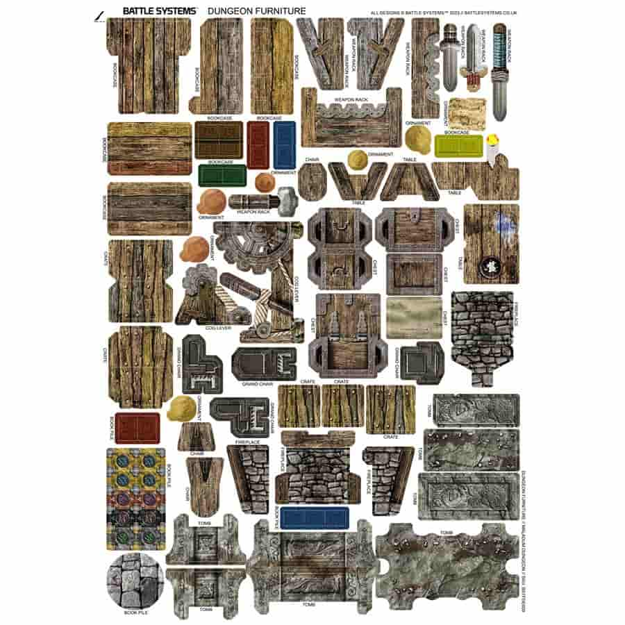 This pack accessorises any dungeon with classic furniture and scatter terrain, from simple tables and chairs, to bookcases filled with arcane lore, to racks of deadly weaponry. You’ll also find chests, crates and tombs ready to be looted and mysterious levers to be pulled, and when all is said and done you can relax by the fire…