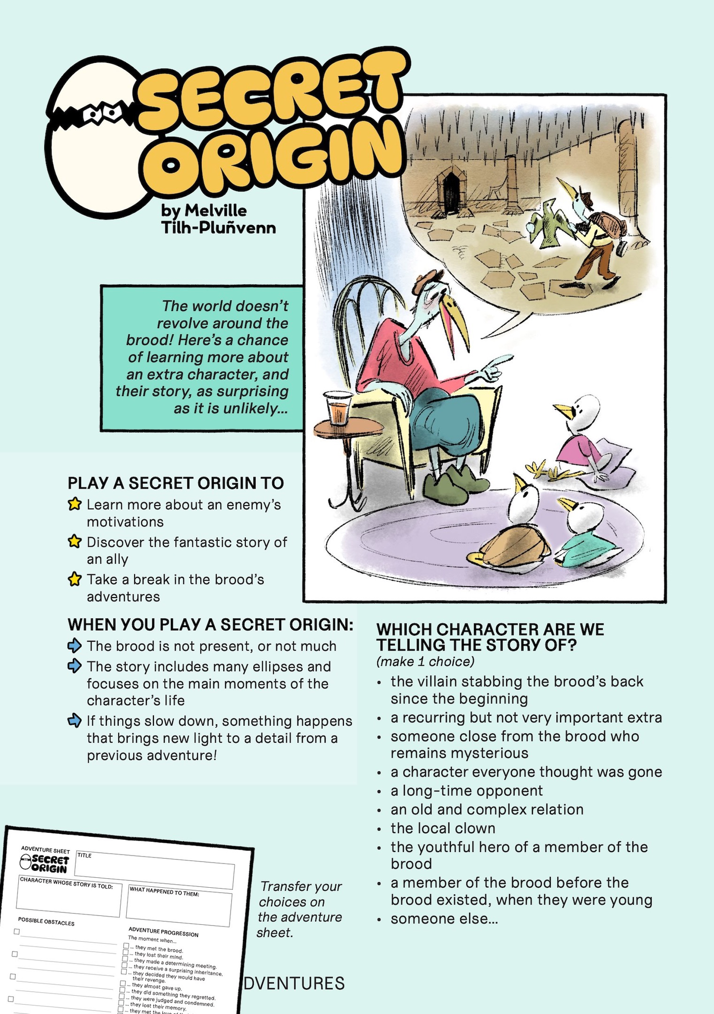 FEATHERED ADVENTURES is a diceless RPG of anthropomorphic birds going on pulp adventures, trying to overcome their flaws to come out on top.