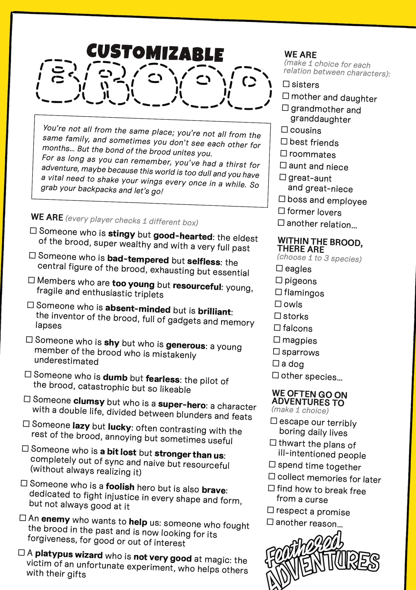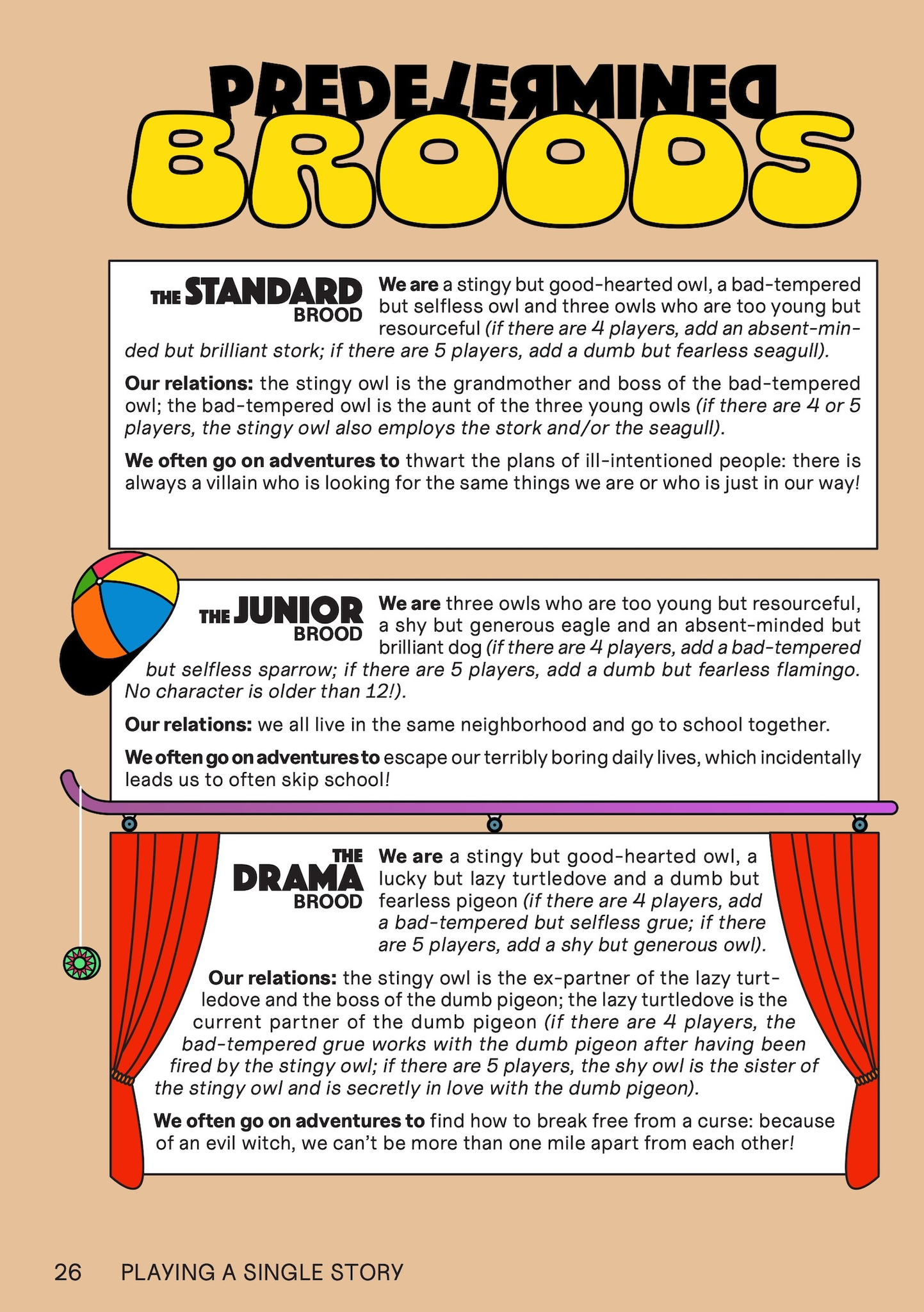 - 6 ready-to-pick character groups: the standard brood, the junior brood, the drama brood and the unexpected brood