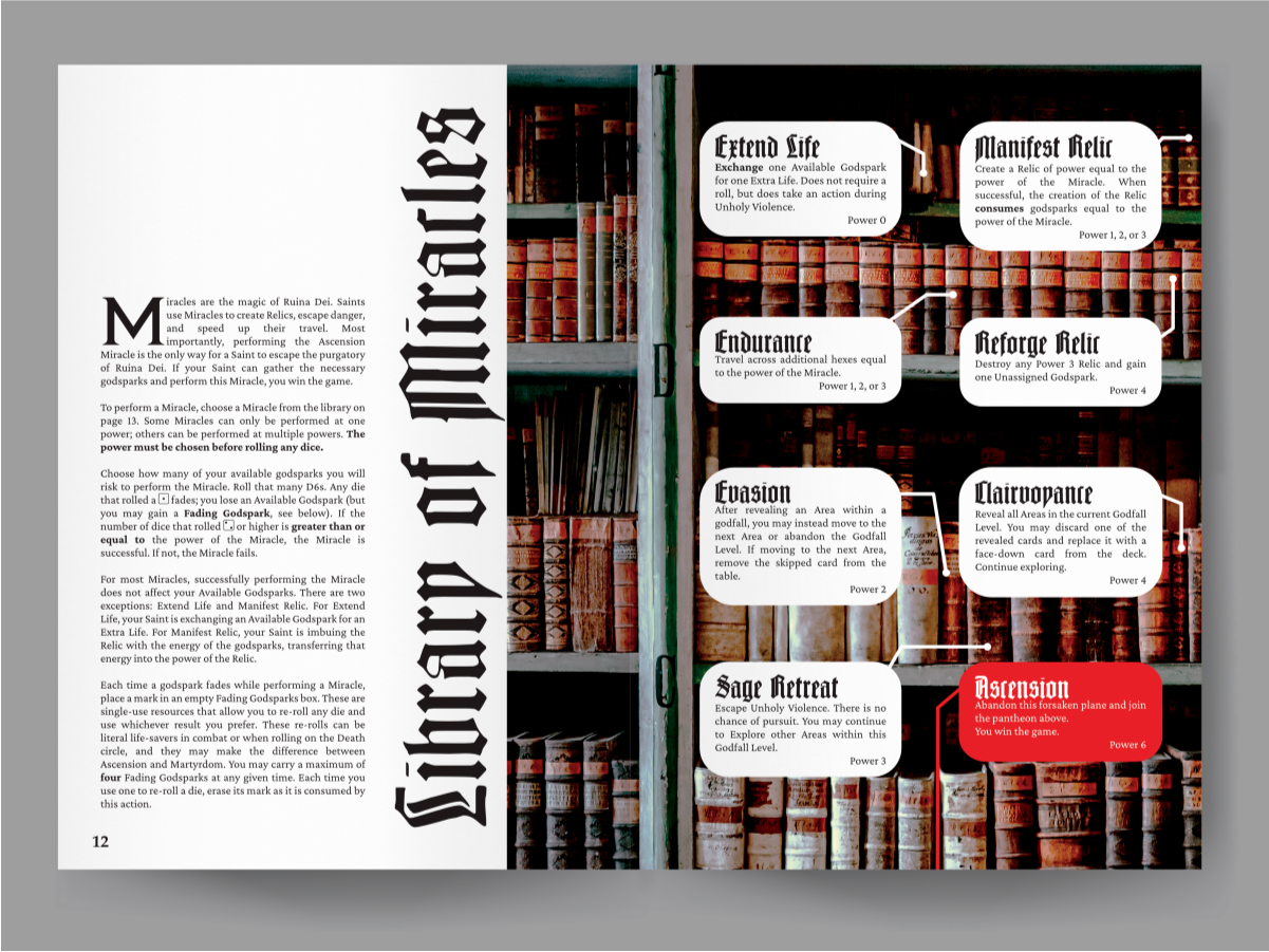 Godspark is a tabletop adventure game for one or two players. You will explore Ruina Dei, a graveyard of the gods, searching the bodies of fallen deities for the godsparks (fragments of divine power) that allow you to stay alive. With enough godsparks, you can perform miracles, the magics of Ruina Dei.